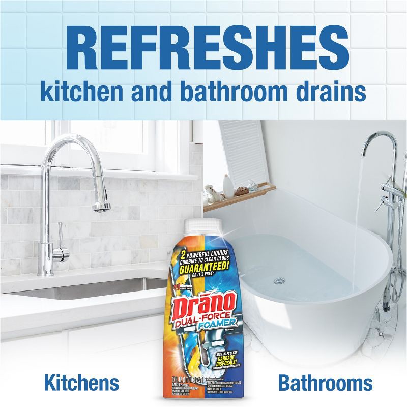 Drano® Dual-Force Foamer Clog Remover unclogs drains with the combination of two powerful liquids. Its cleaning foam reaches where ordinary drain clog removers can't. A strong bathroom clog cleaner, D…