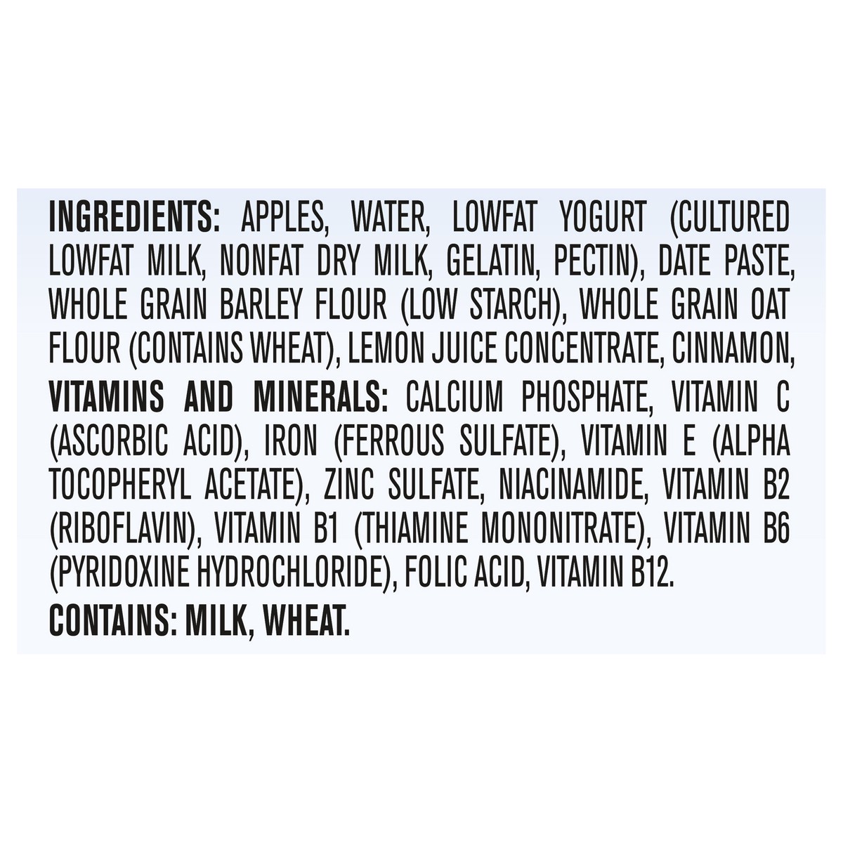 Apples, Water, Lowfat Yogurt (Cultured Lowfat Milk, Nonfat Dry Milk, Gelatin, Pectin), Date Paste, Whole Grain Barley Flour (Low Starch), Whole Grain Oat Flour (Contains Wheat), Lemon Juice Concentrat…