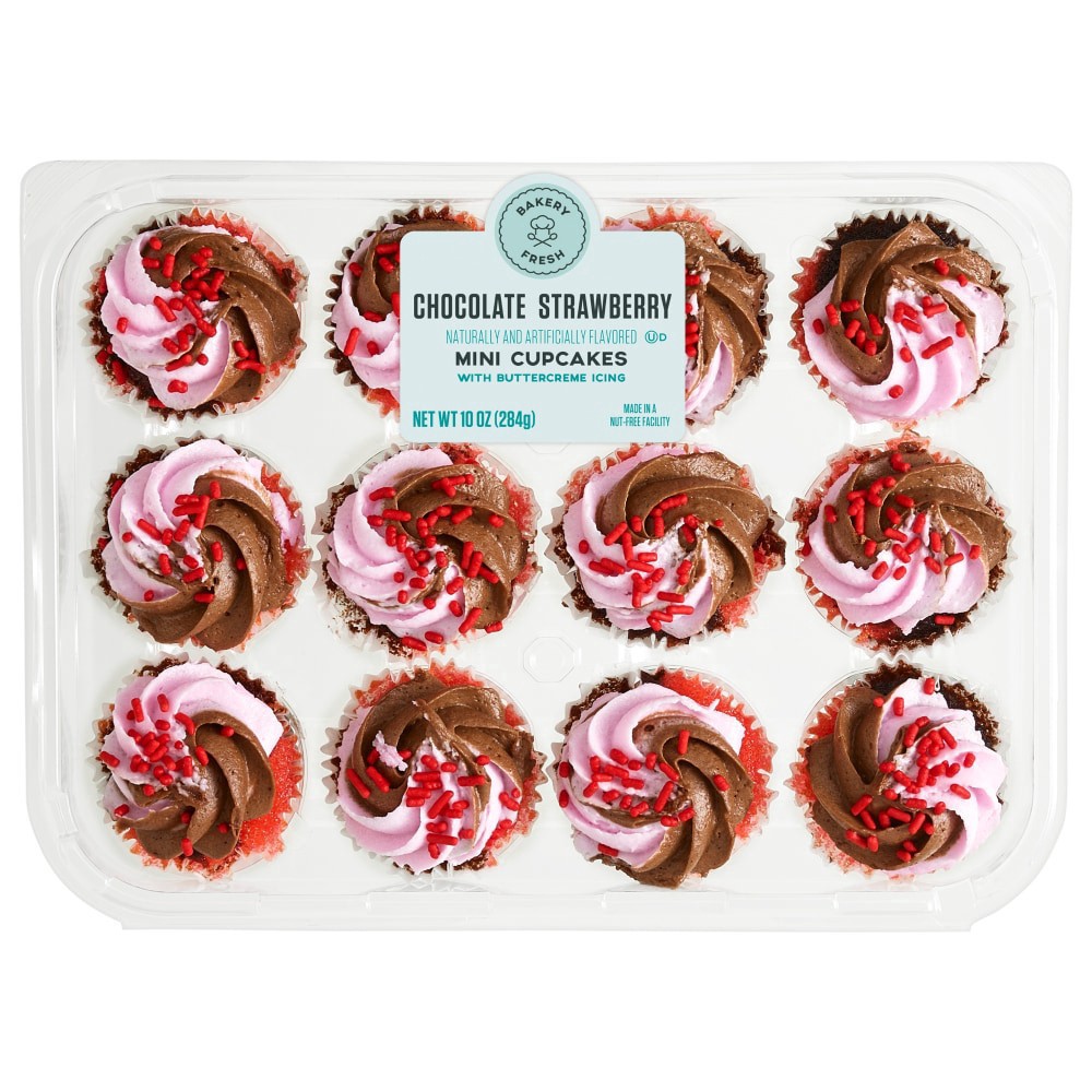 Bakery Fresh Valentine's Day Chocolate Strawberry Mini Cupcakes with Buttercreme Icing are a sweet way to celebrate love! These tantalizing treats are made of marble cake and topped with a colorful sw…