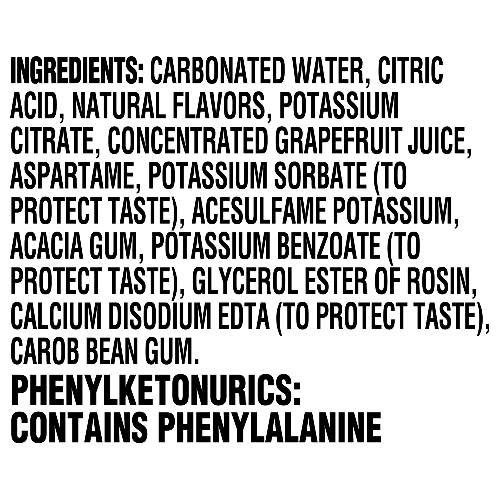 Carbonated Water, Citric Acid, Natural Flavors, Potassium Citrate, Concentrated Grapefruit Juice, Aspartame, Potassium Sorbate (To Protect Taste), Acesulfame Potassium, Acacia Gum, Potassium Benzoate …