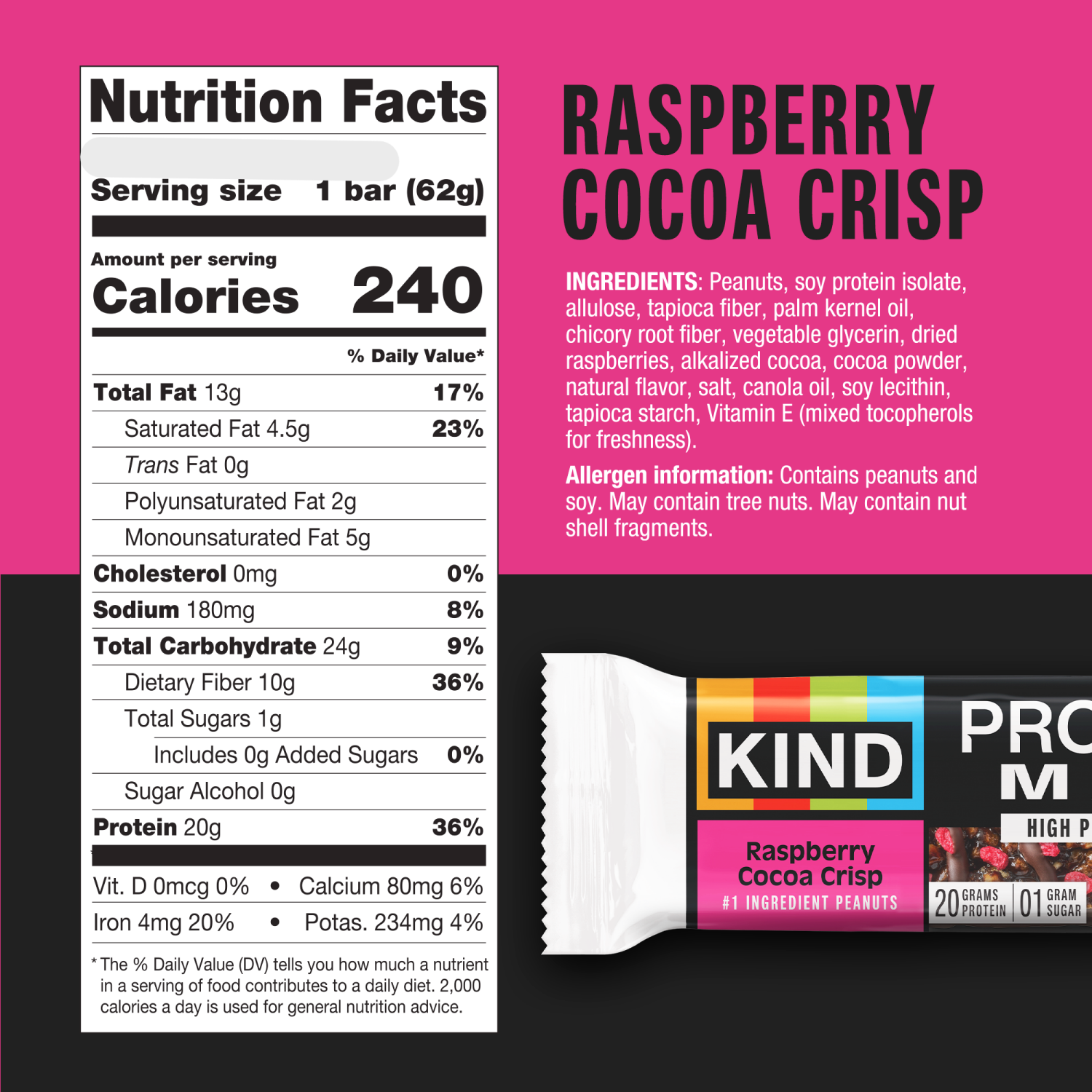 Peanuts, Soy Protein Isolate, Allulose, Tapioca Fiber, Palm Kernel Oil, Chicory Root Fiber, Vegetable Glycerin, Dried Raspberries, Alkalized Cocoa, Cocoa Powder, Natural Flavor, Salt, Canola Oil, Soy …