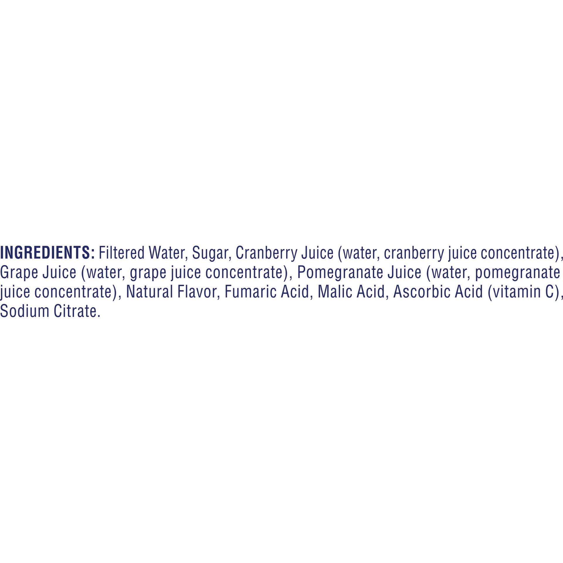 Filtered Water, Sugar, Cranberry Juice (Water, Cranberry Juice Concentrate), Grape Juice (Water, Grape Juice Concentrate), Pomegranate Juice (Water, Pomegranate Juice Concentrate), Natural Flavor, Fum…