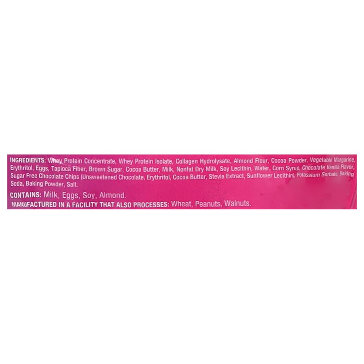 Whey Protein Concentrate, Whey Protein Isolate, Collagen Hydrolysate, Almond Flour, Cocoa Powder, Vegetable Margarine, Erythritol, Eggs, Tapioca Fiber, Brown Sugar, Cocoa Butter, Milk, Nonfat Dry Milk…