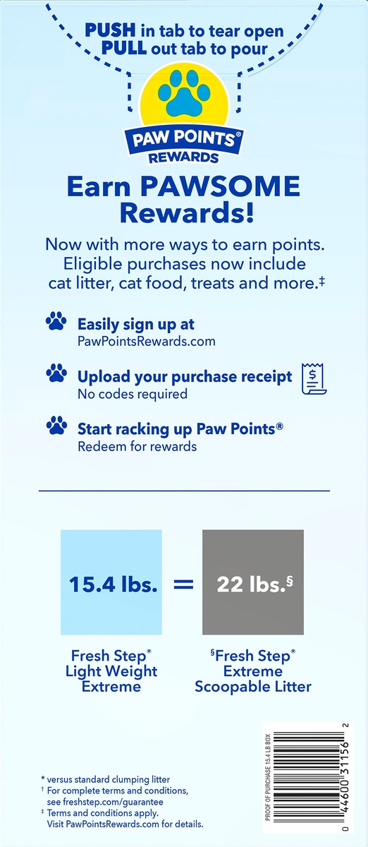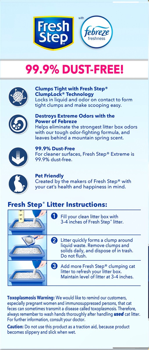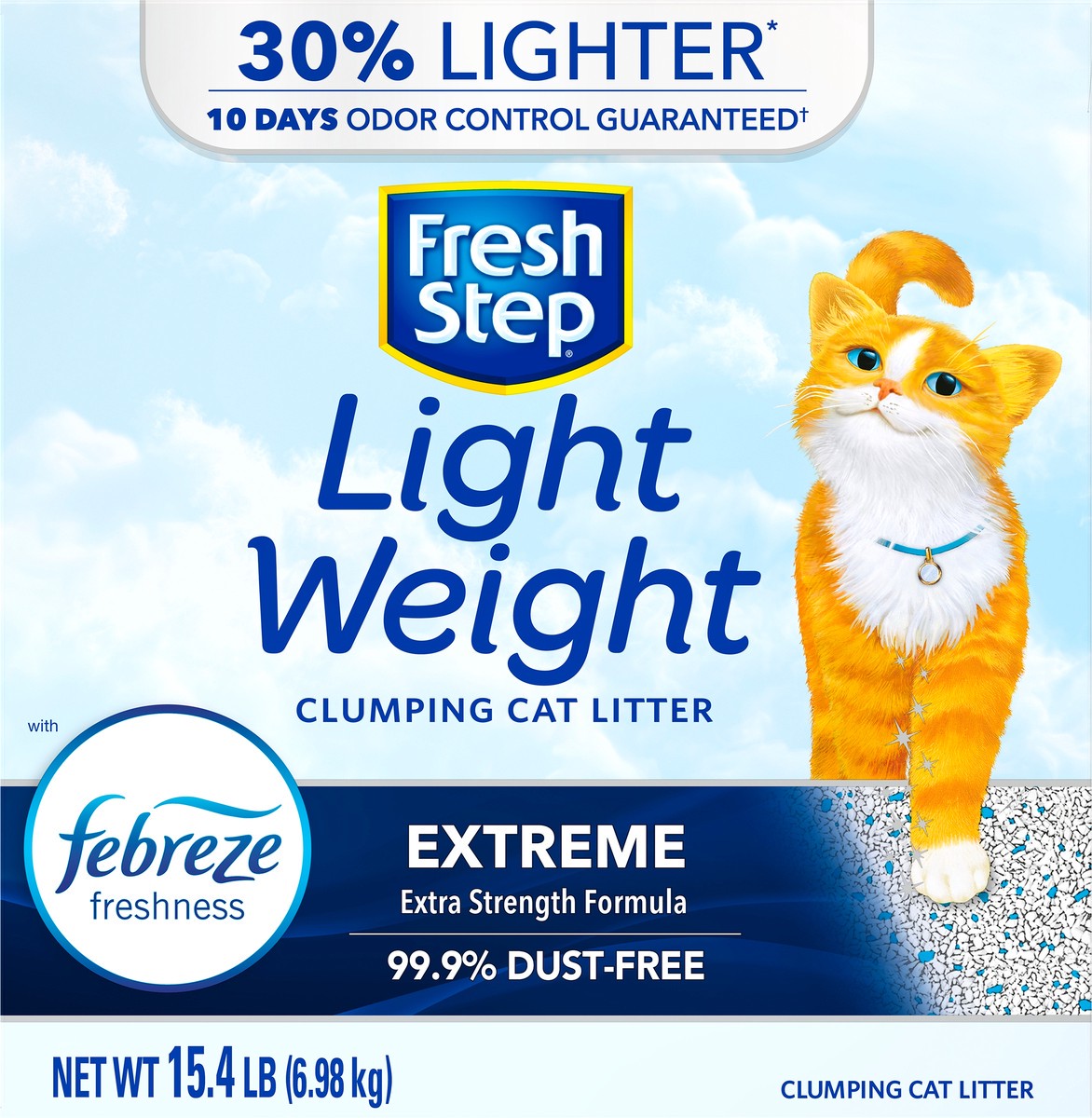 30% lighter (versus standard clumping litter). Extra strength formula. With Febreze Freshness. 99.9% dust-free. 15.4 lbs. = 22 lbs (Fresh Step Extreme Scoopable Litter). Fresh Step Light Weight Extrem…