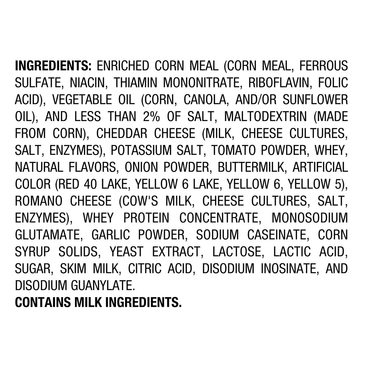 Enriched Corn Meal (Corn Meal, Ferrous Sulfate, Niacin, Thiamin Mononitrate, Riboflavin, Folic Acid), Vegetable Oil (Corn, Canola, And/Or Sunflower Oil), Salt, Whey, Maltodextrin (Made From Corn), But…