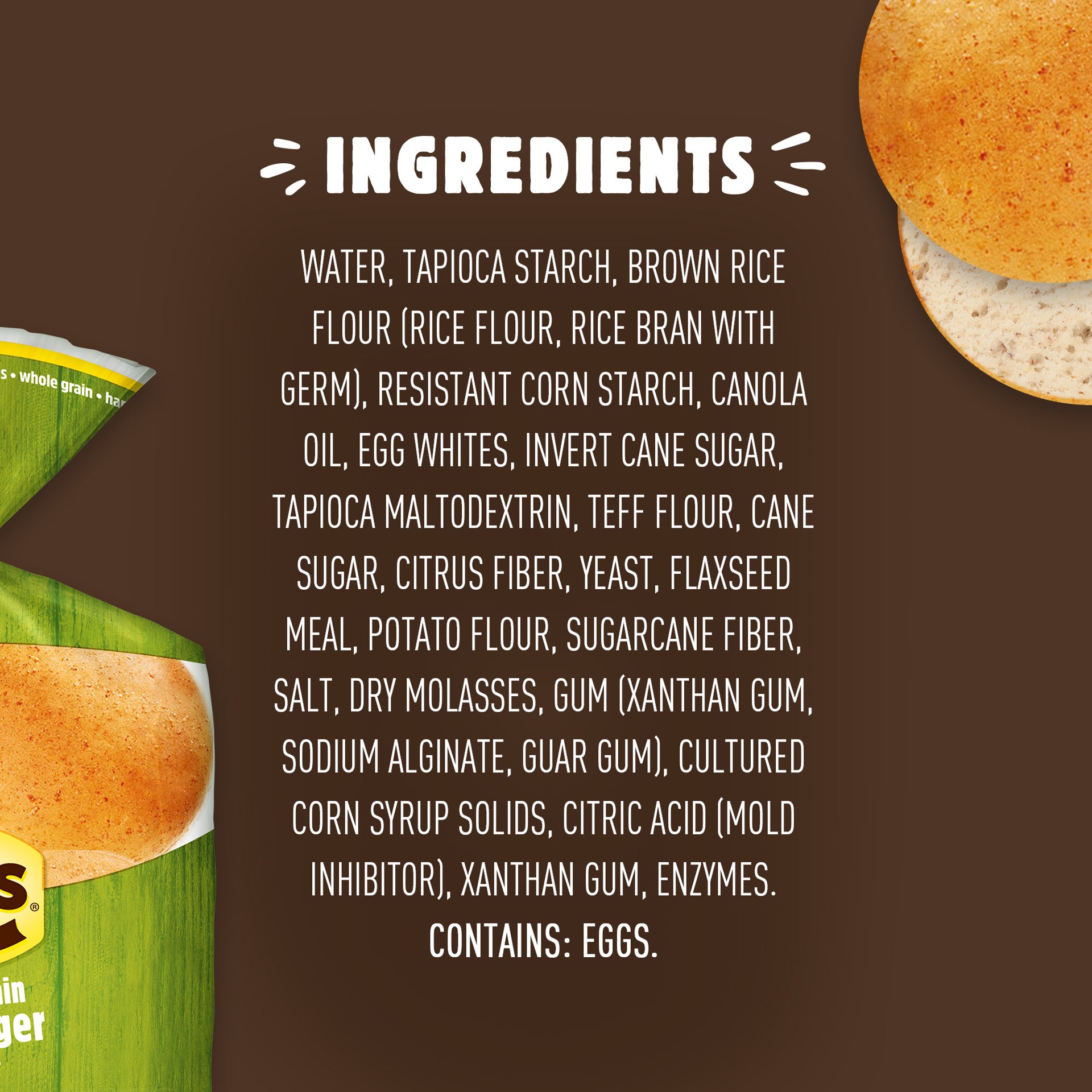 Water, Tapioca Starch, Brown Rice Flour (Rice Flour, Rice Bran with Germ), Resistant Corn Starch, Canola Oil, Egg Whites, Invert Cane Sugar, Tapioca Maltodextrin, Teff Flour, Cane Sugar, Citrus Fiber,…