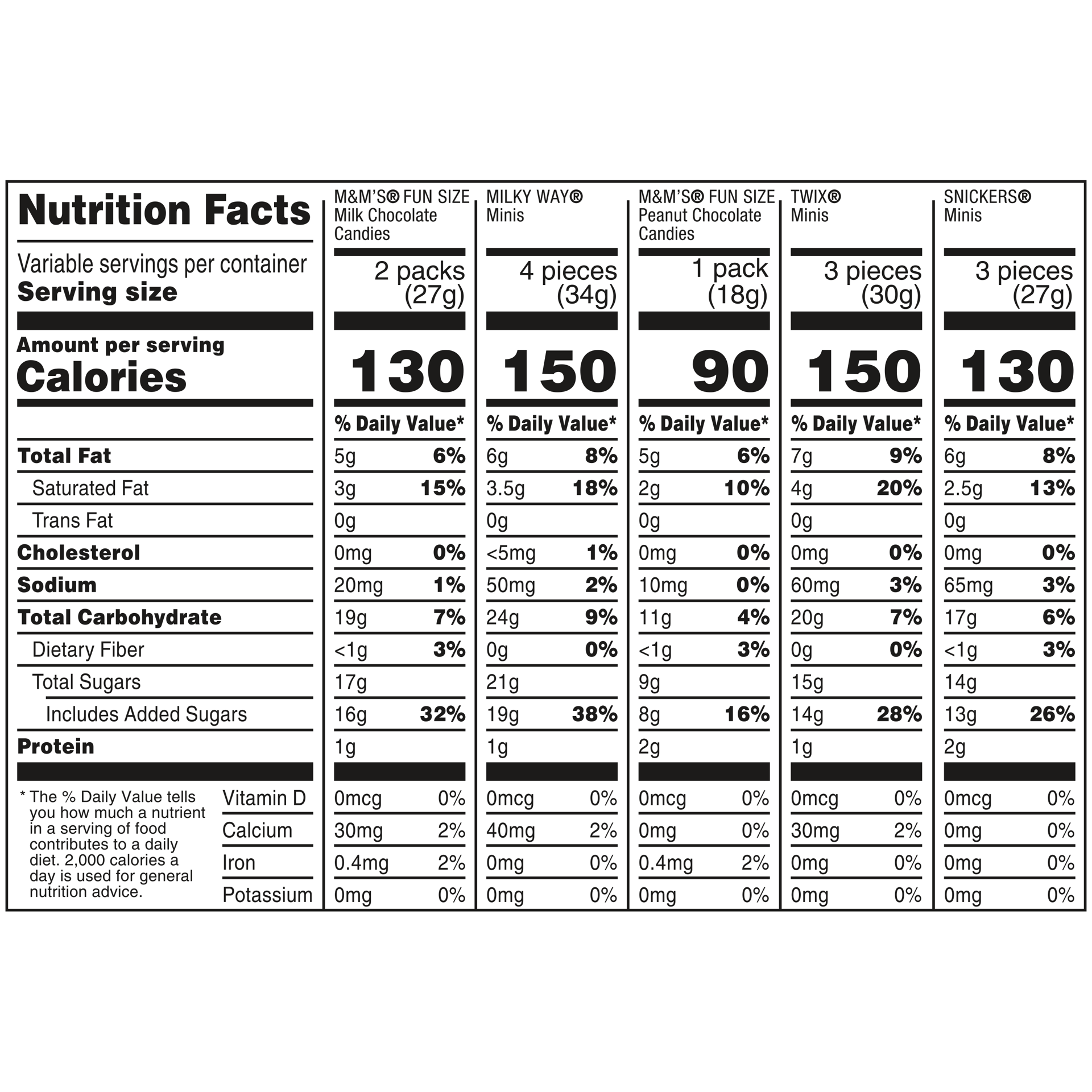M&M’S FUN SIZE Milk Chocolate Candies INGREDIENTS: MILK CHOCOLATE (SUGAR, CHOCOLATE, SKIMMILK, COCOA BUTTER, LACTOSE, MILKFAT, SOY LECITHIN,SALT, NATURAL FLAVOR), SUGAR, CORNSTARCH; LESSTHAN 1% OF…