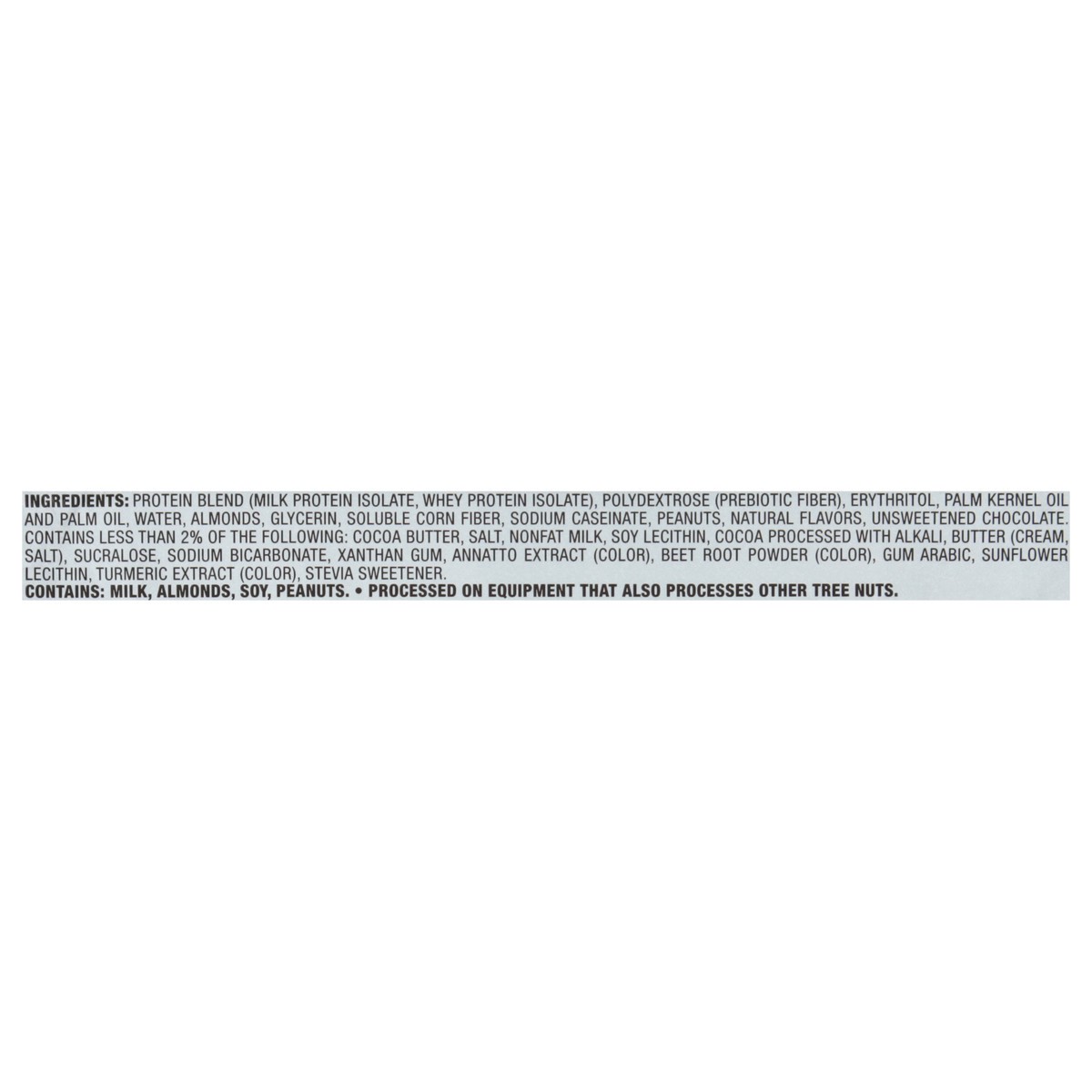 Protein Blend (Milk Protein Isolate, Whey Protein Isolate), Polydextrose (Prebiotic Fiber), Erythritol, Palm Kernel Oil and Palm Oil, Water, Almonds, Glycerin, Soluble Corn Fiber, Sodium Caseinate, Pe…