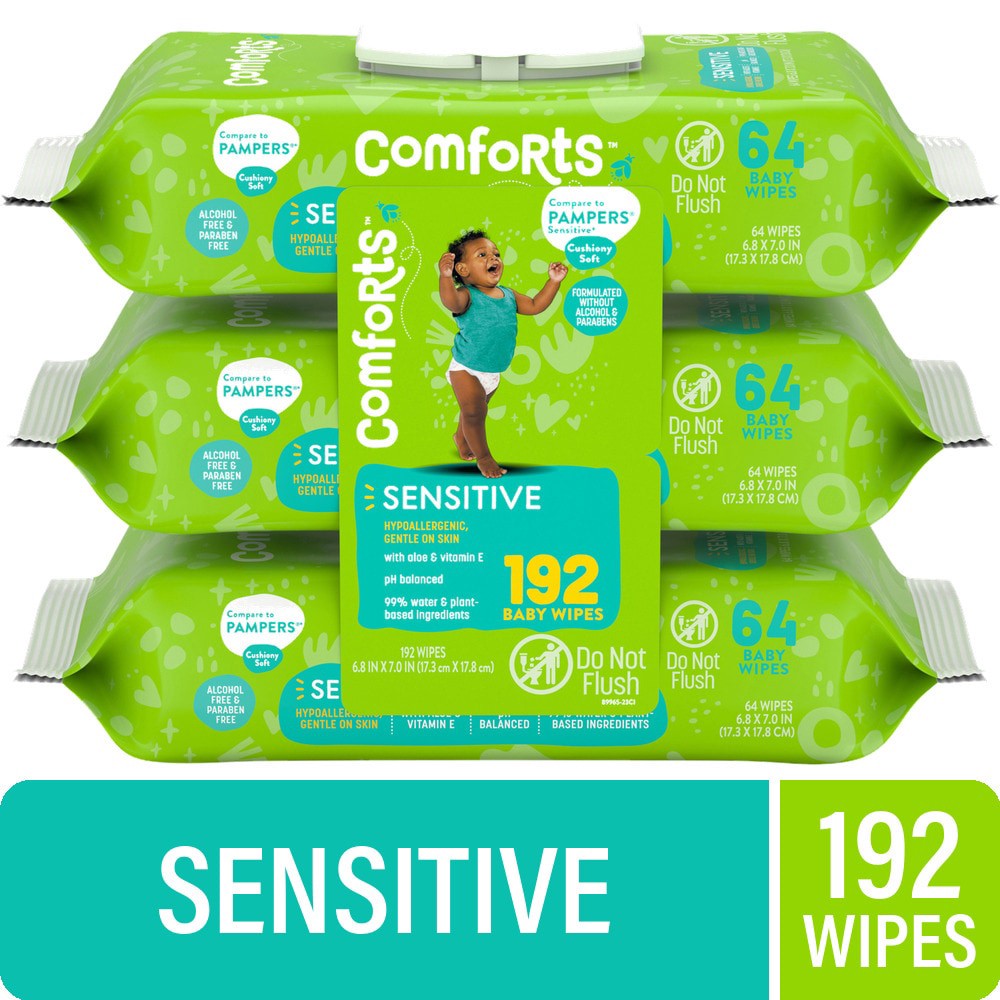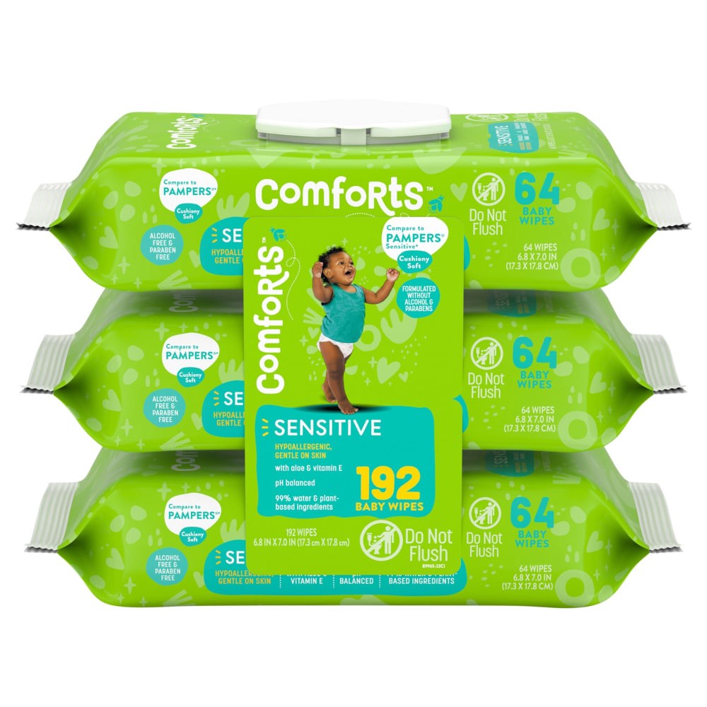 Comforts™ Sensitive Baby Wipes offer gentle cleansing for baby. These hypoallergenic wipes are made from cushiony soft, 99% water and plant-based ingredients for easy cleaning and care. They contain t…