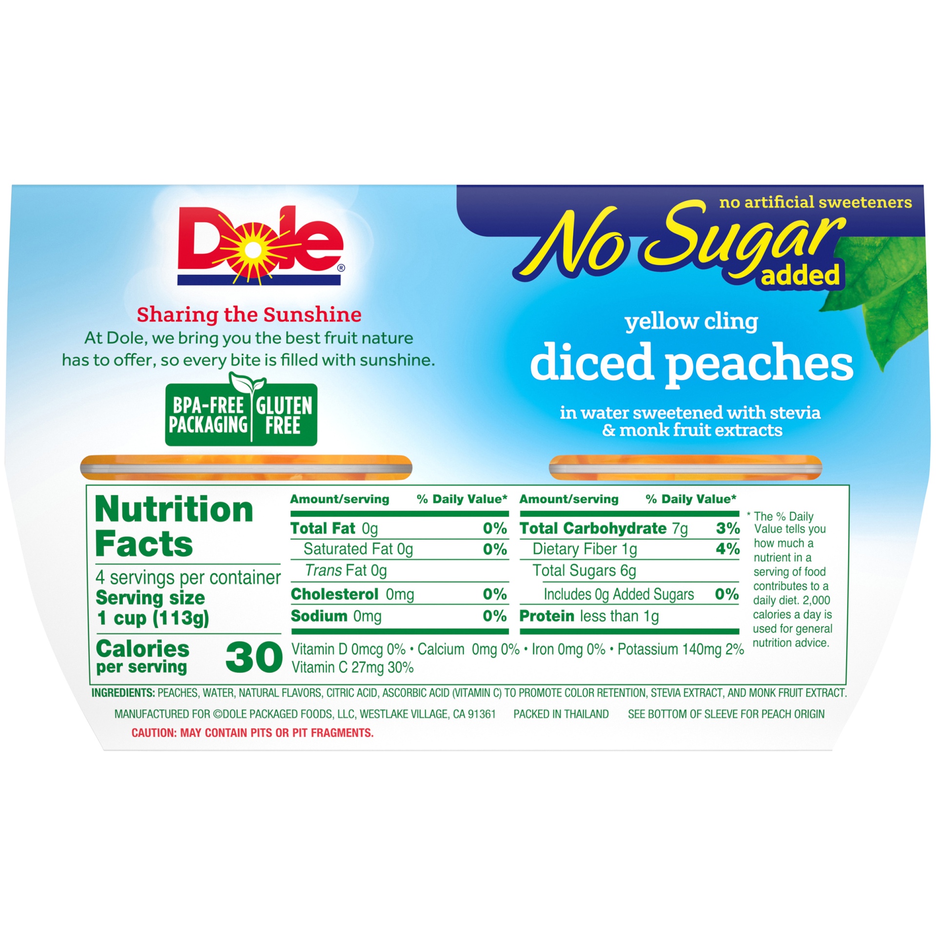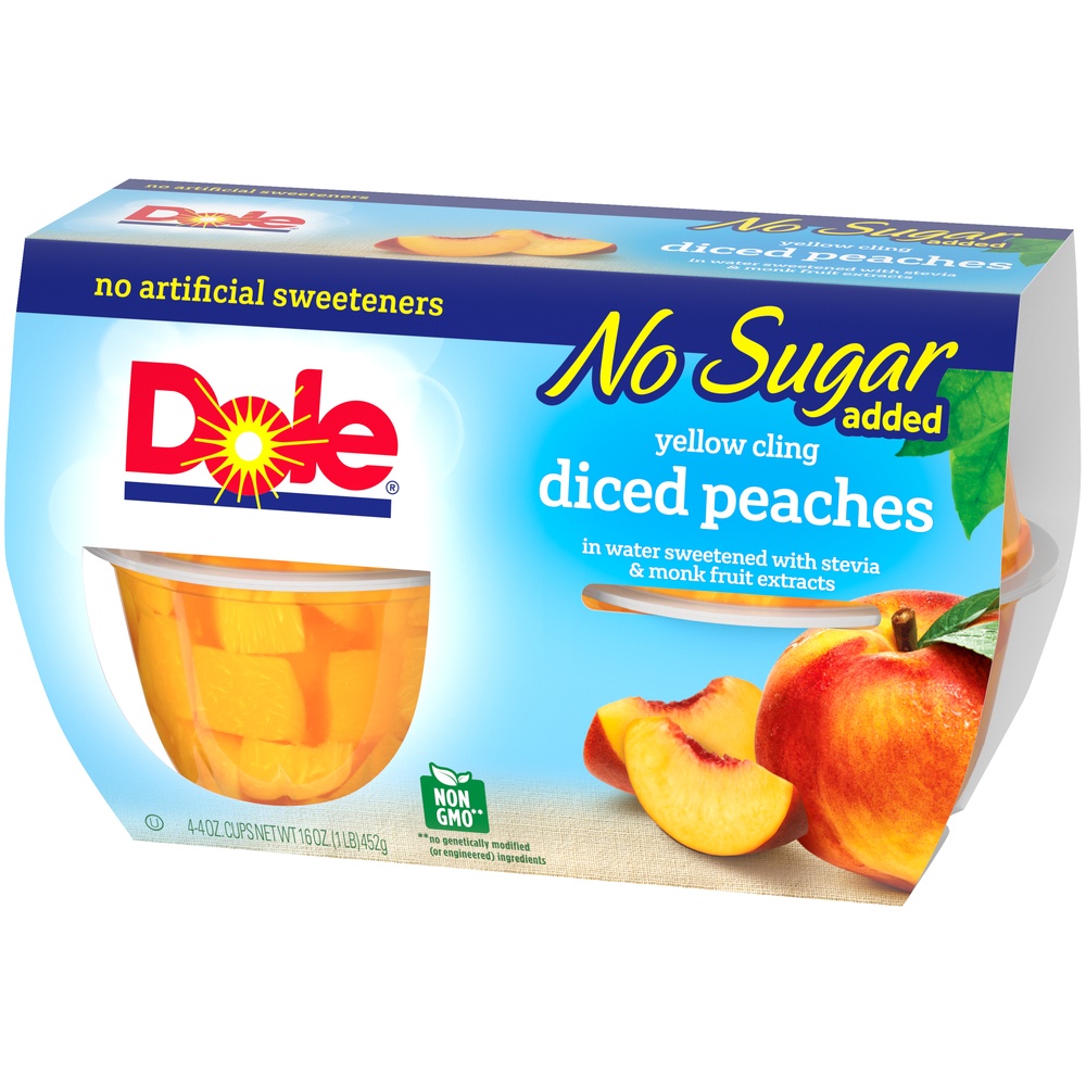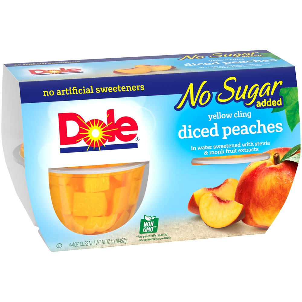 - DOLE FRUIT BOWLS Diced Peaches with No Sugar Added are an excellent source of Vitamin C, gluten free and made from all-natural fruit and non-GMO ingredients with no added sugar