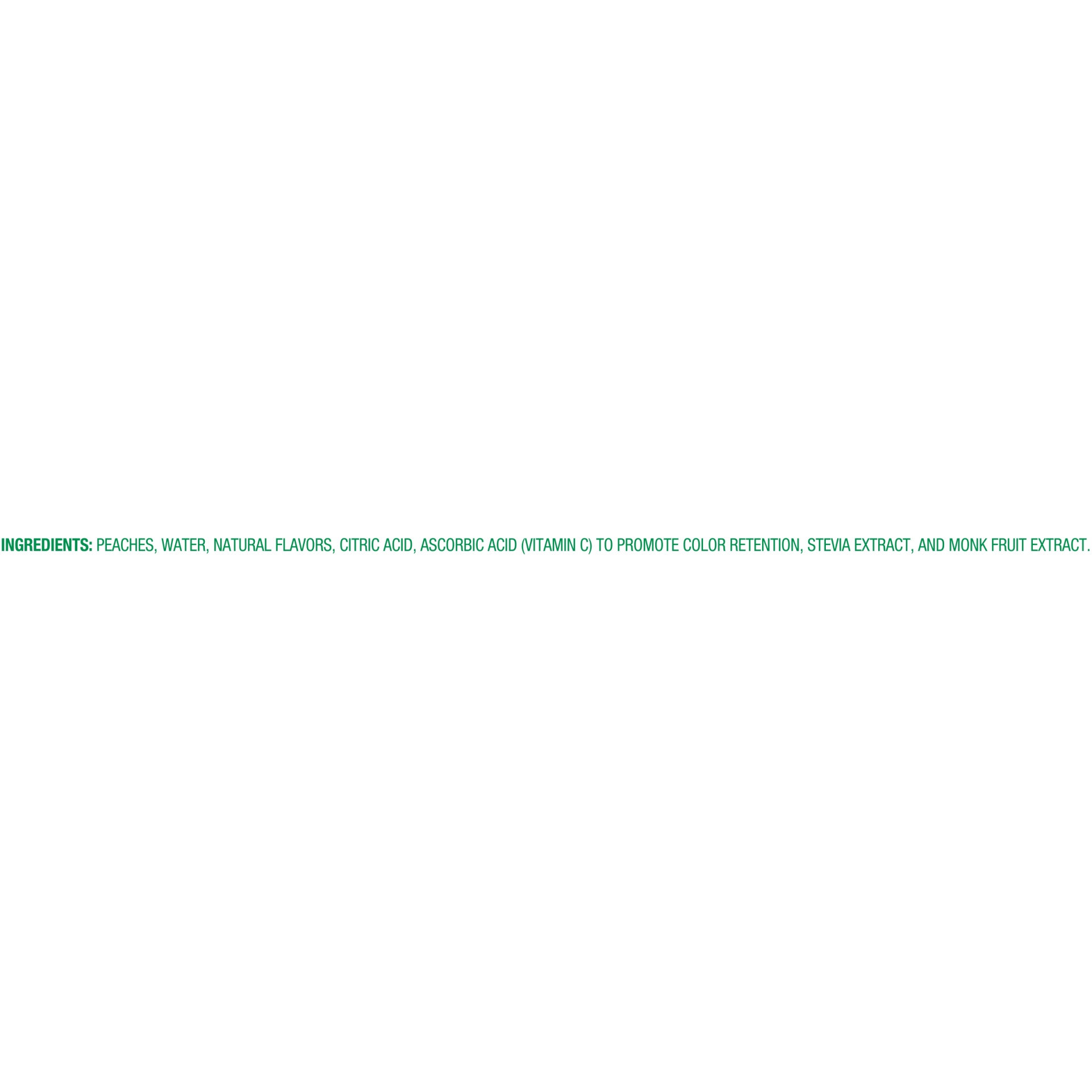 Peaches, Water, Natural Flavors, Citric Acid, Ascorbic Acid (Vitamin C) to Promote Color Retention, Stevia Extract.