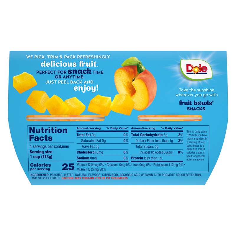 - With DOLE FRUIT BOWLS Diced Peaches with No Sugar Added, you can enjoy the refreshing taste of delicious diced peaches anytime of year