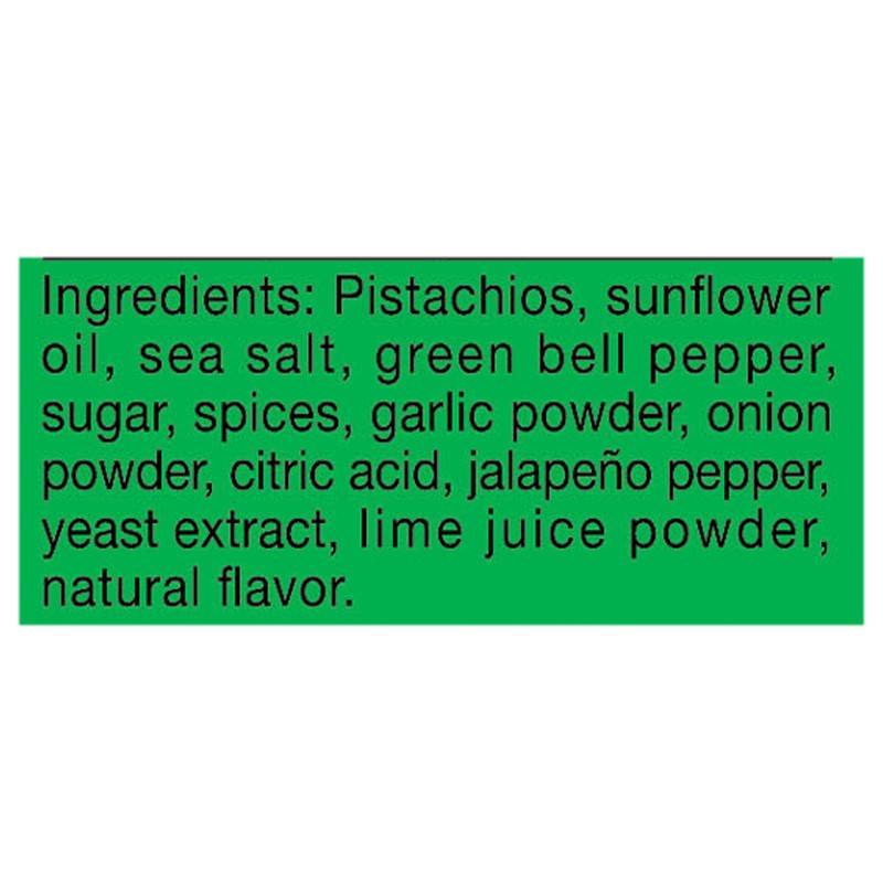 Pistachios, Sunflower Oil, Sea Salt, Green Bell Pepper, Sugar, Spices, Garlic Powder, Onion Powder, Citric Acid, Jalapeno Pepper, Yeast Extract, Lime Juice Powder, Natural Flavor.