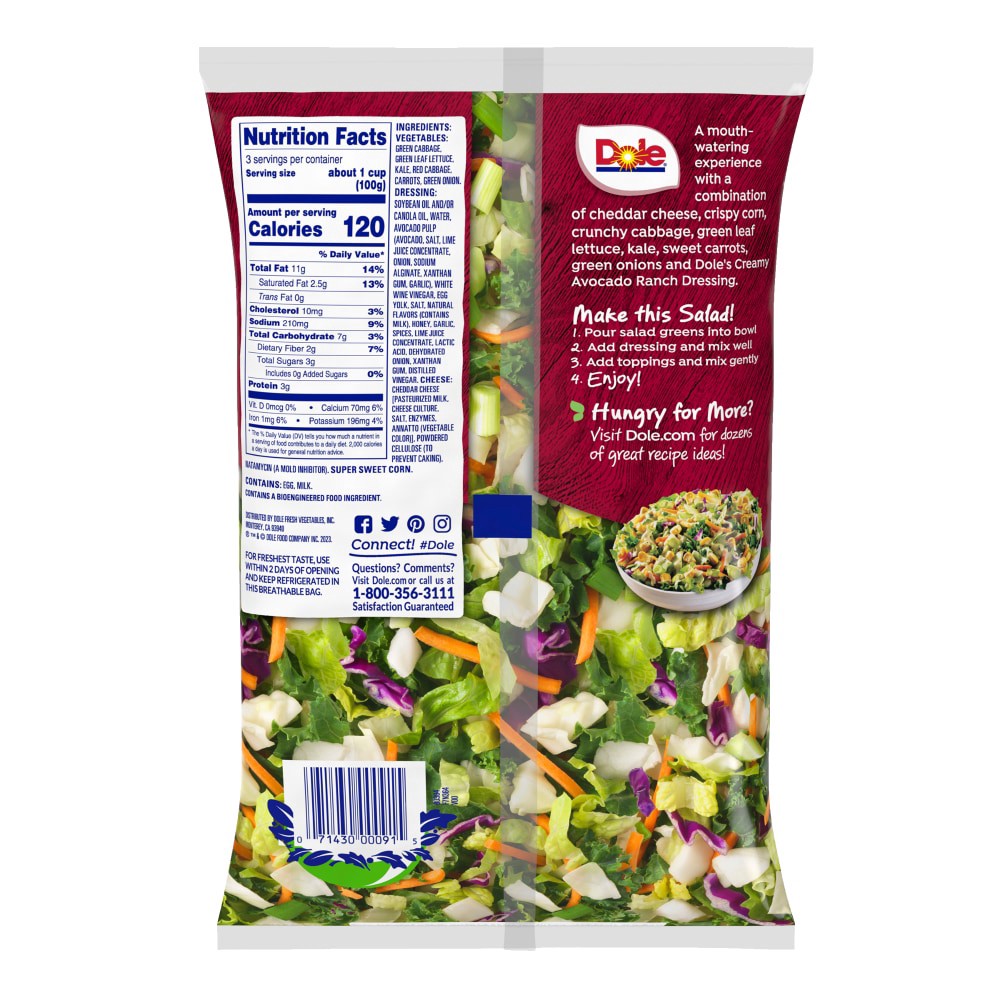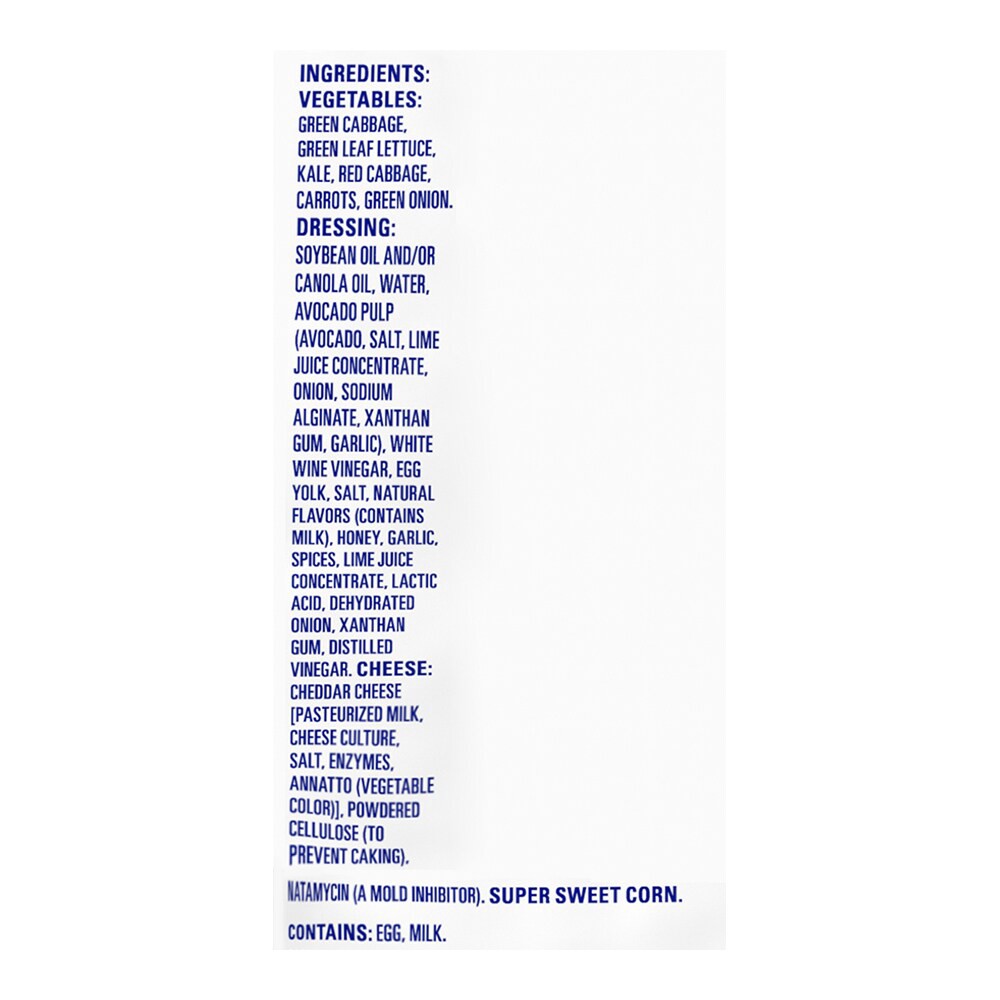 green leaf lettuce, green cabbage, red cabbage, kale, carrots, green onions, cheddar cheese, creamy avocado ranch dressing and crispy corn, thoroughly washed, refrigerated, 11.3 oz.
