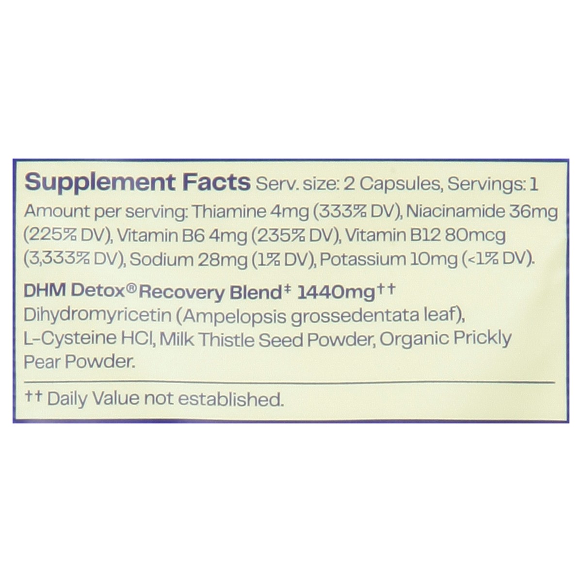 DHM Detox Recovery Blend: Dihydromyricetin (Ampelopsis Grossedentata Leaf), L-Cysteine HCl, Milk Thistle Seed Powder, Organic Prickly Pear Powder. Other Ingredients: Hypromellose Veggie Capsule, Micro…