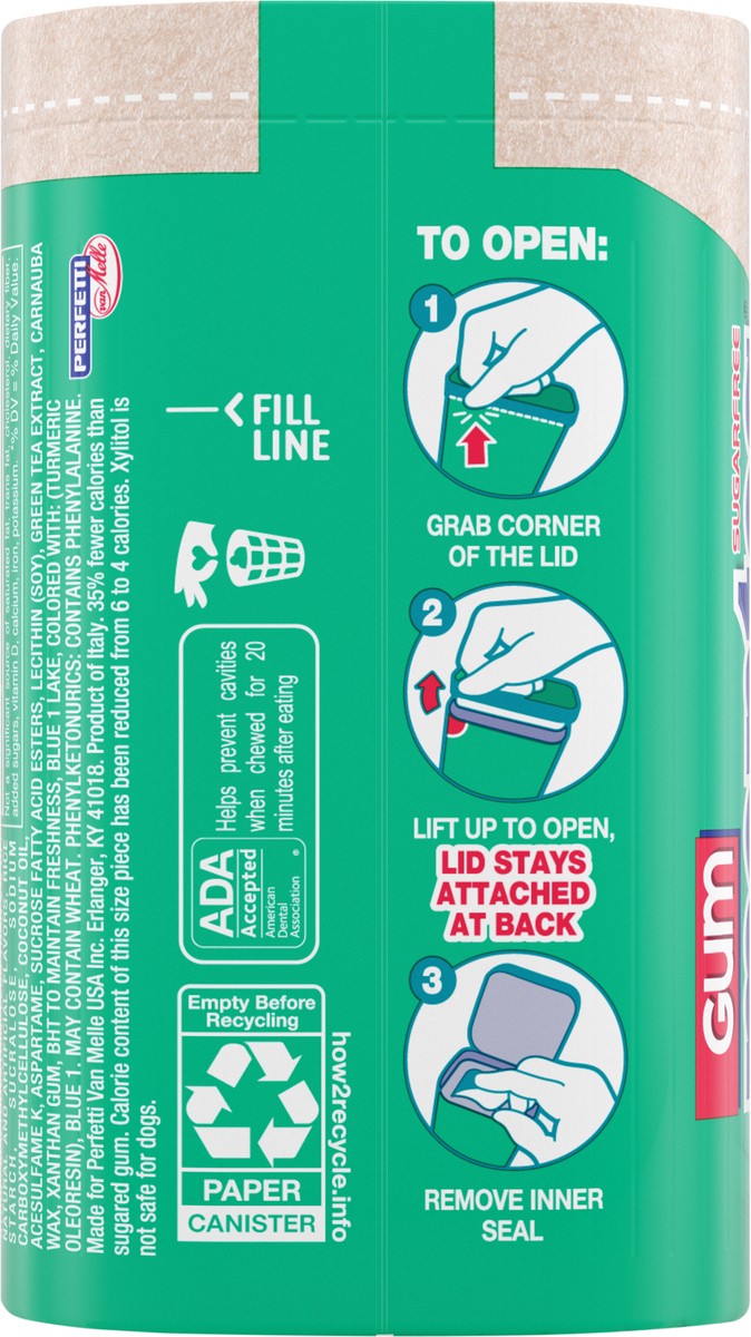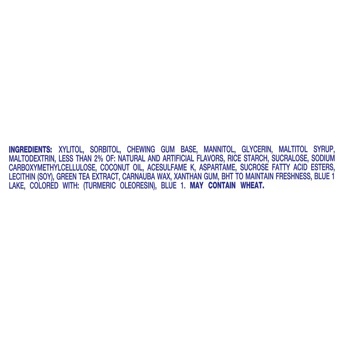 Xylitol, Sorbitol, Chewing Gum Base, Mannitol, Glycerin, Maltitol Syrup, Maltodextrin, Less than 2% of: Natural and Artificial Flavors, Rice Starch, Sucralose, Sodium Carboxymethylcellulose, Coconut O…