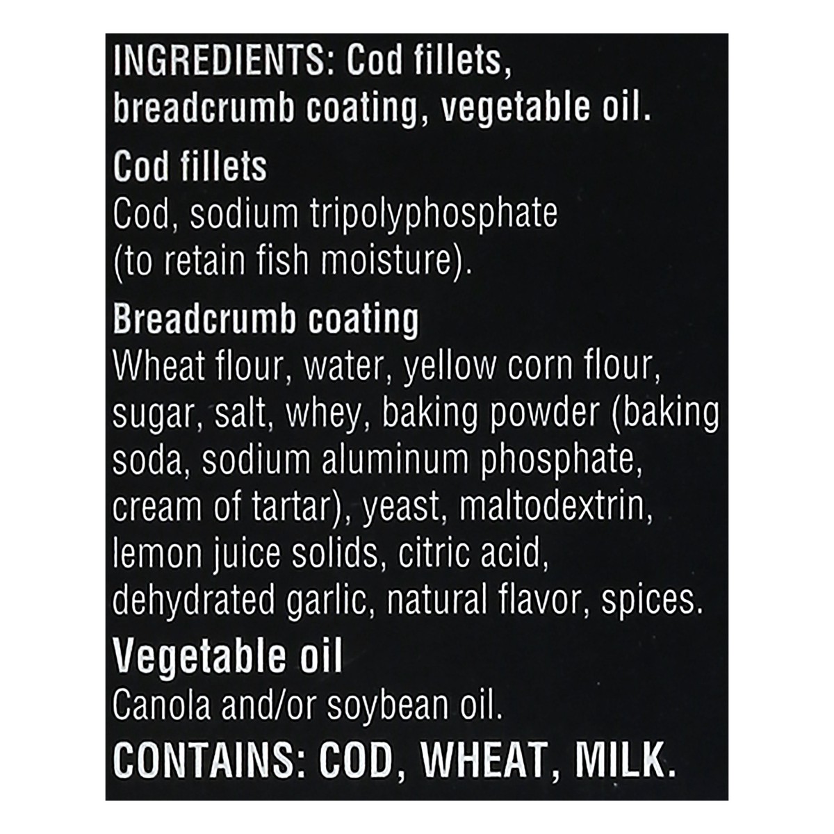 Cod Fillets, Breadcrumb Coaling, Vegetable Oil. Cod Fillets: Cod Sodium Tripolyphosphate (to Retain Fish Moisture). Breadcrumb Coating: Wheat Flour, Water, Yellow Corn Flour, Sugar, Salt, Whey, Baking…