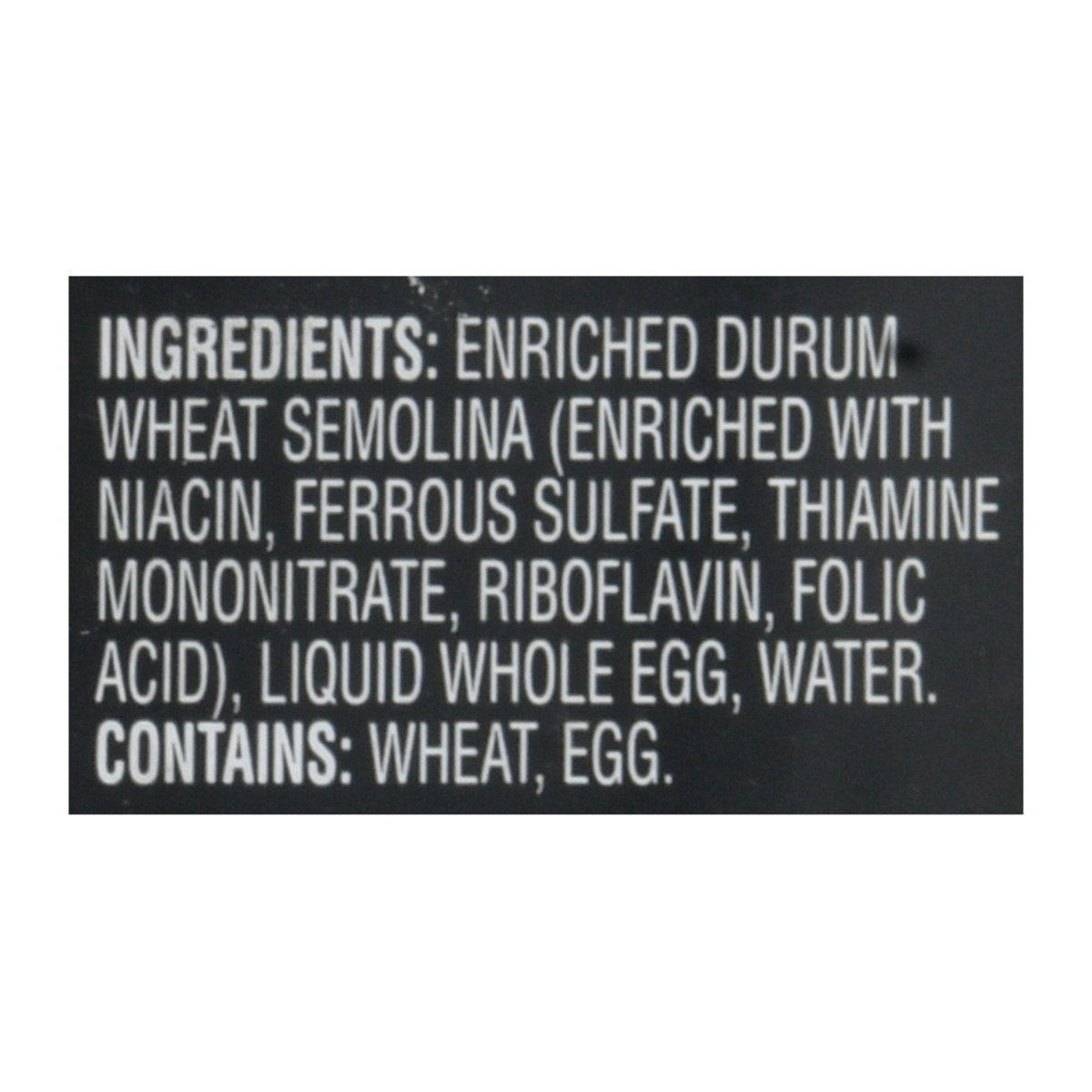 Enriched Durum Wheat Semolina (Enriched with Niacin, Ferrous Sulfate, Thiamine Mononitrate, Riboflavin, Folic Acid), Liquid Whole Egg, Water.