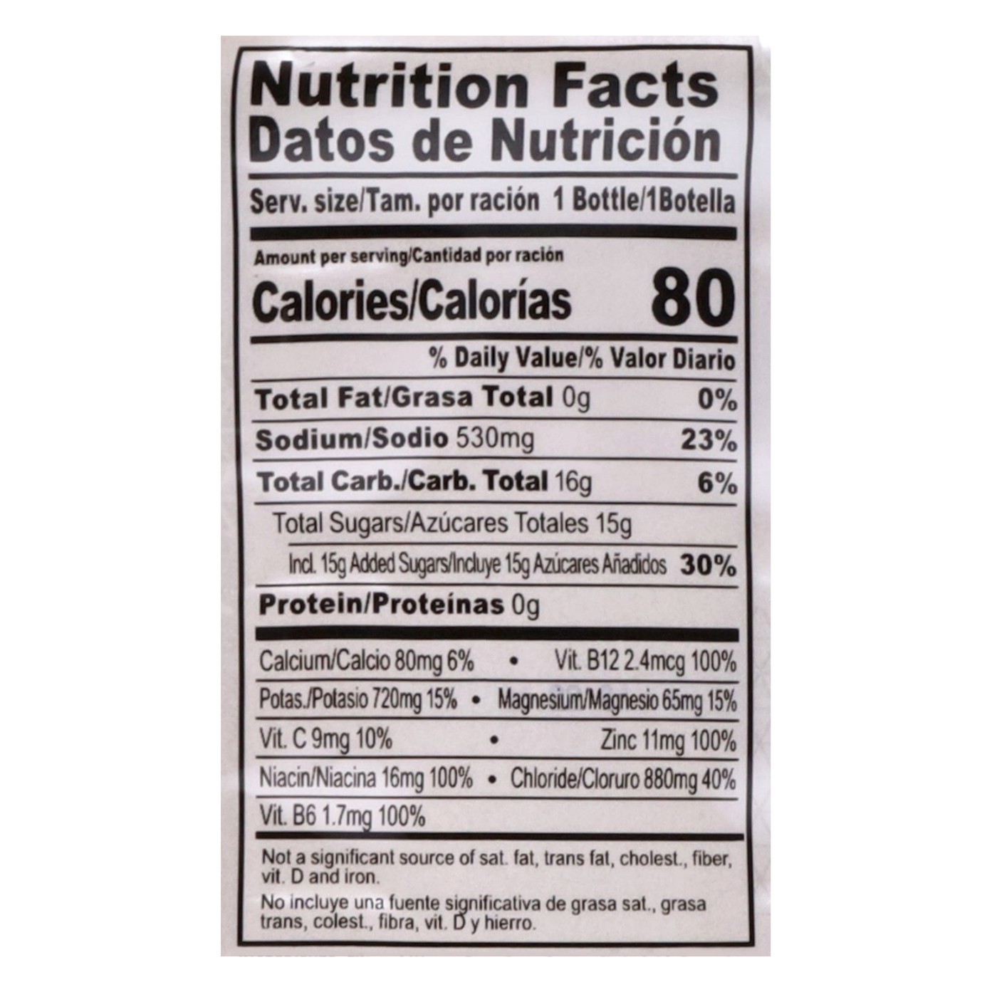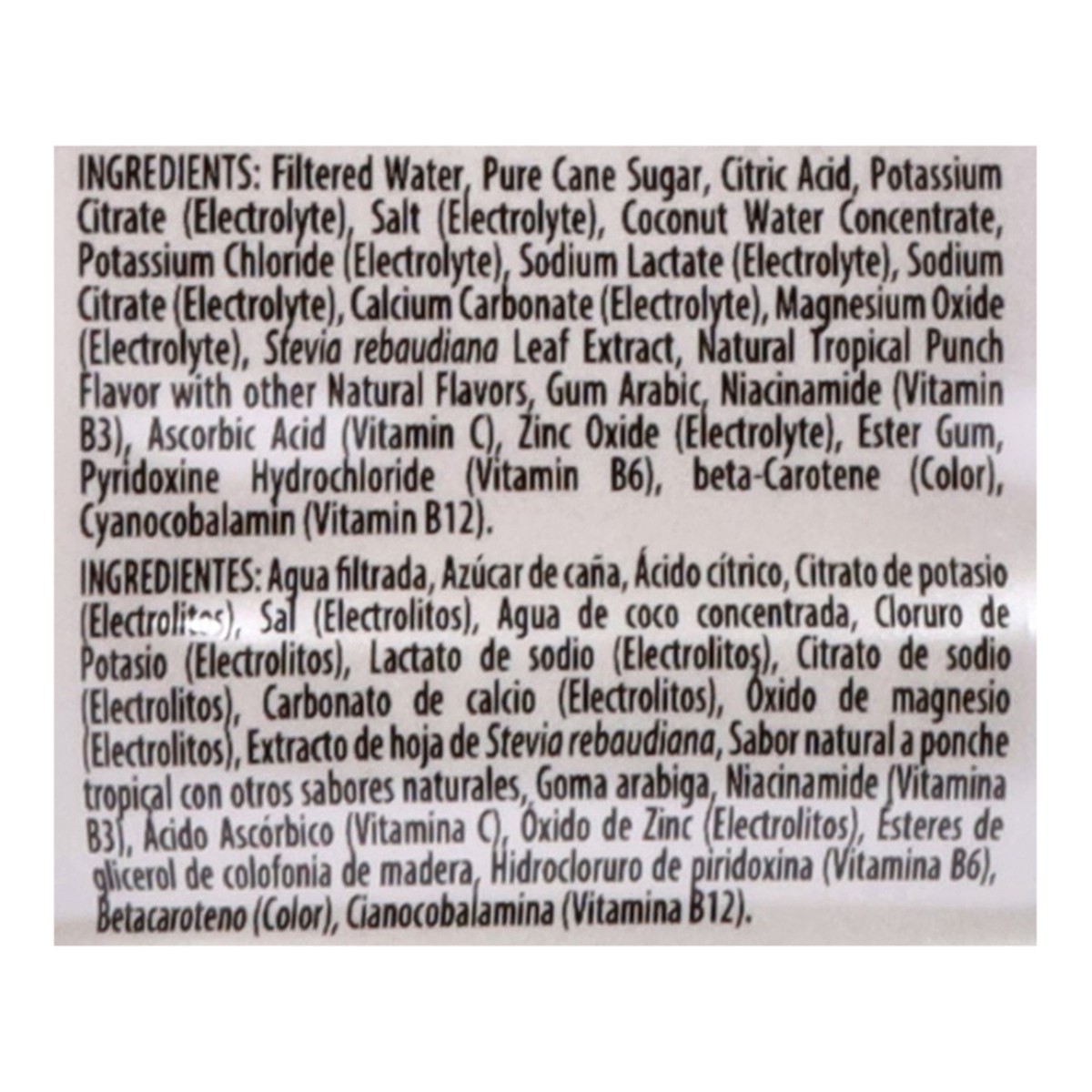 Filtered Water, Pure Cane Sugar, Citric Acid, Potassium Citrate (Electrolyte), Salt (Electrolyte), Coconut Water Concentrate, Potassium Chloride (Electrolyte), Sodium Lactate (Electrolyte), Sodium Cit…