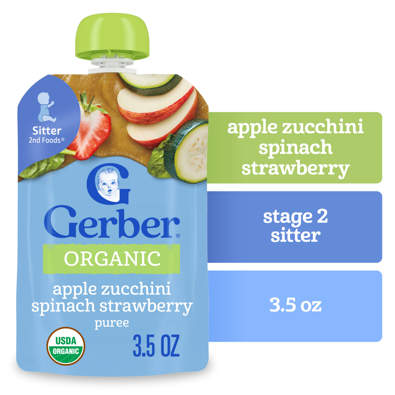 Gerber Stage 2 Baby Food, Organic Apple Zucchini Spinach Strawberry Puree, 3.5 oz Pouch