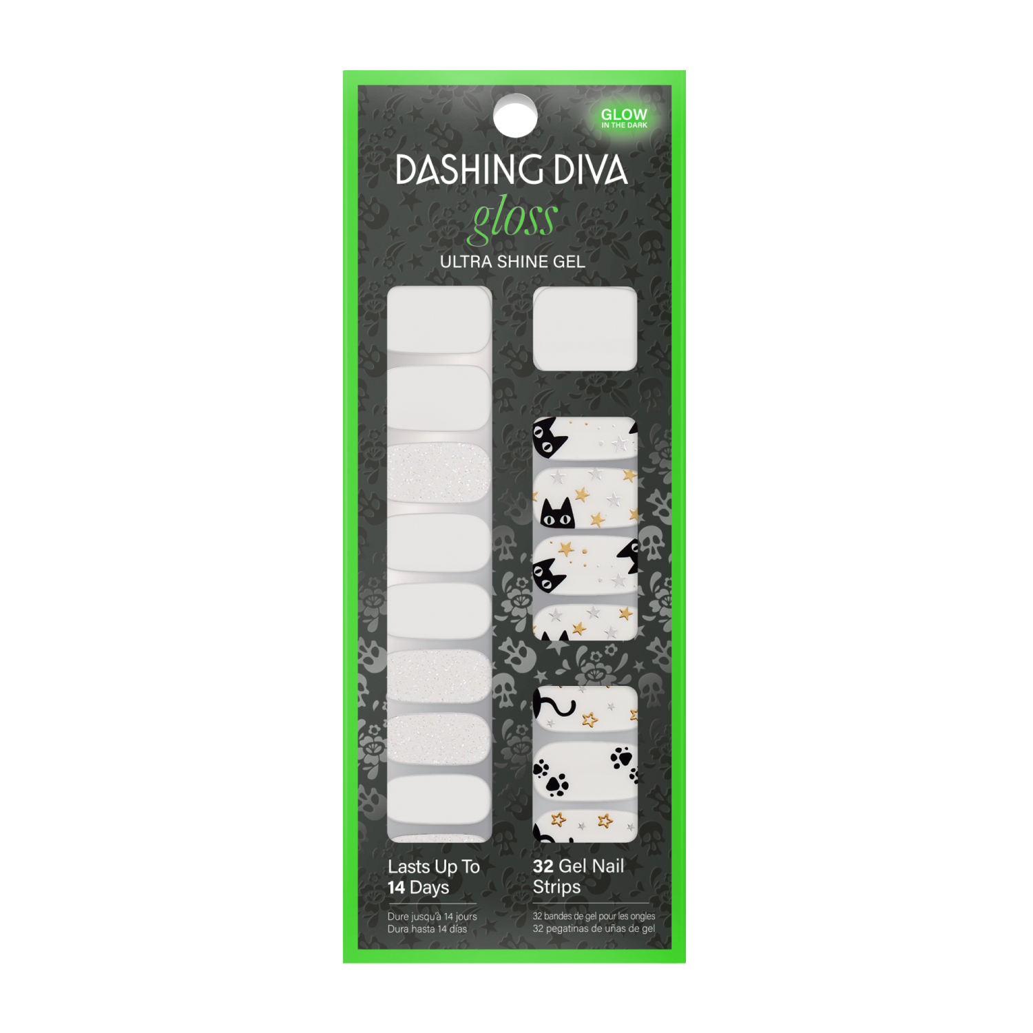 White gel nail strips featuring black cats, gold foil stars, and silver iridescent glitter with a glossy, high-shine finish. GLOSS Ultra Shine Gel are easy-to-apply nail strips that deliver quick, lon…