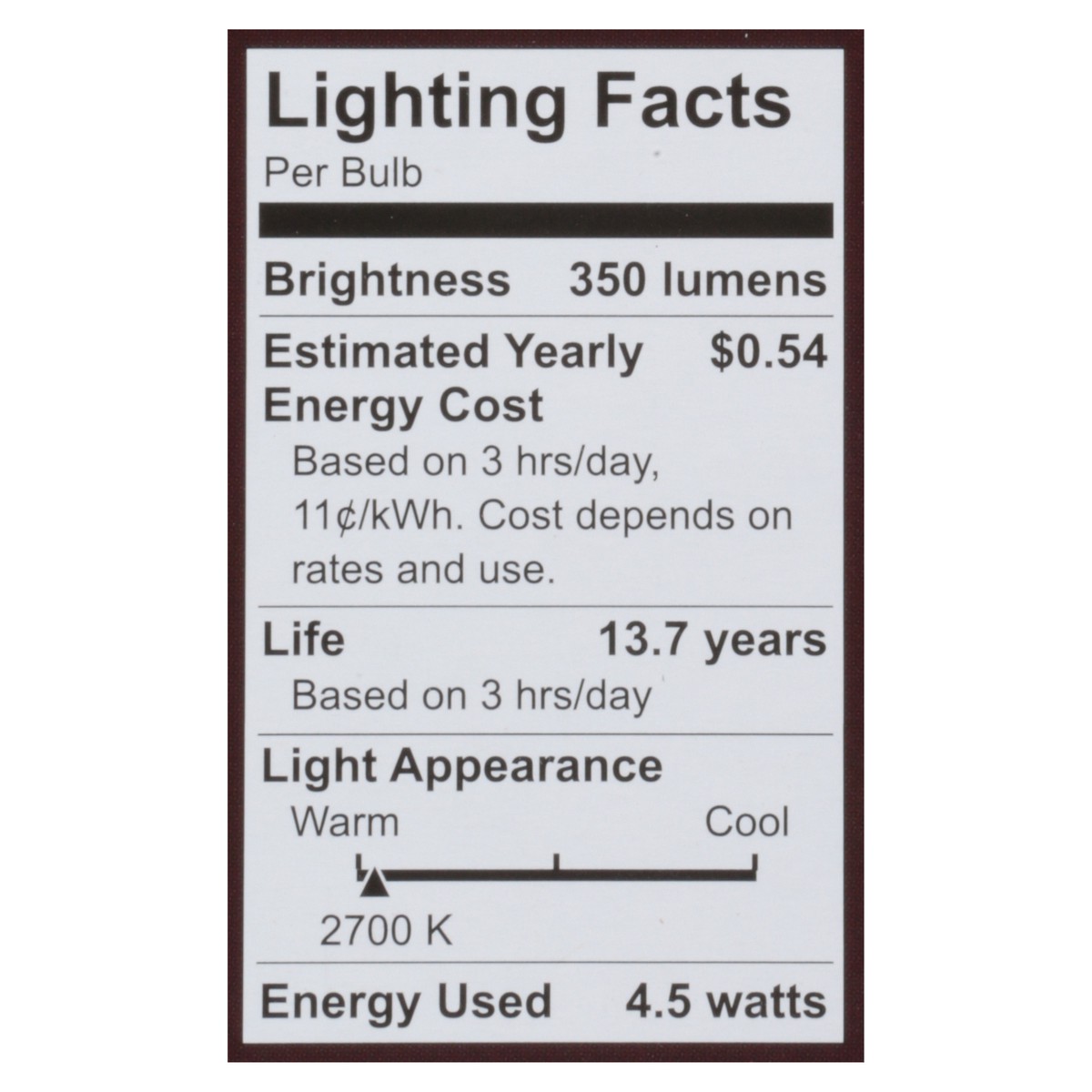 Brightness Quantity: 350 lumens. Energy Info: $0.54 based on 3 hrs/day, 11 cents/kWh. Cost depends on rates and use. 4.5 watts. Package Info: 1. Bulb Info: LED. Is Dimmable. Has Energy Star Logo. Bulb…