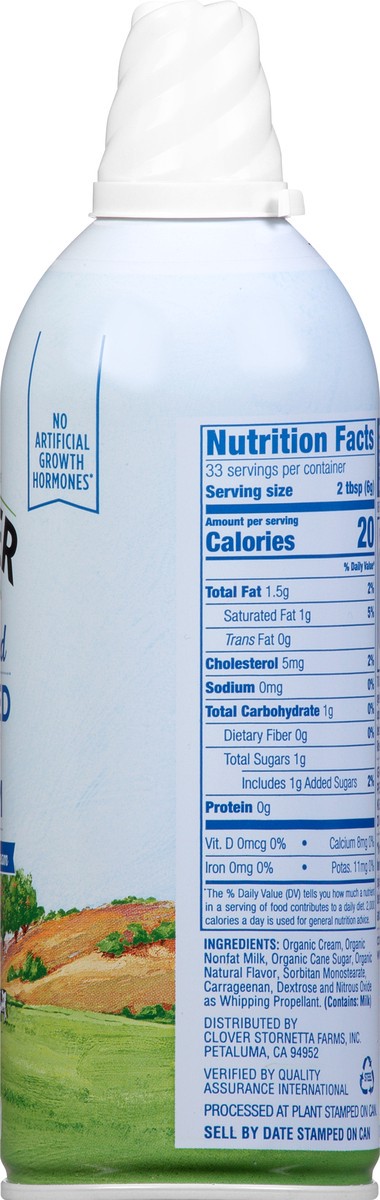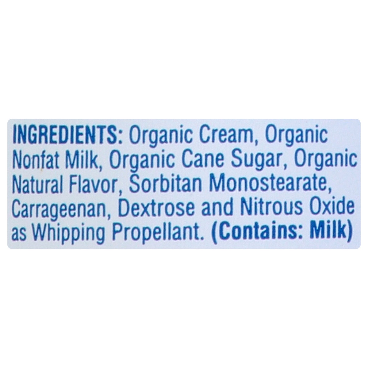 Organic Cream, Organic Nonfat Milk, Organic Cane Sugar, Organic Natural Flavor, Sorbitan Monostearate, Carrageenan, Dextrose and Nitrous Oxide as Whipping Propellant.