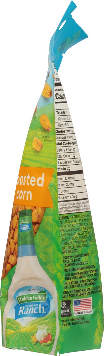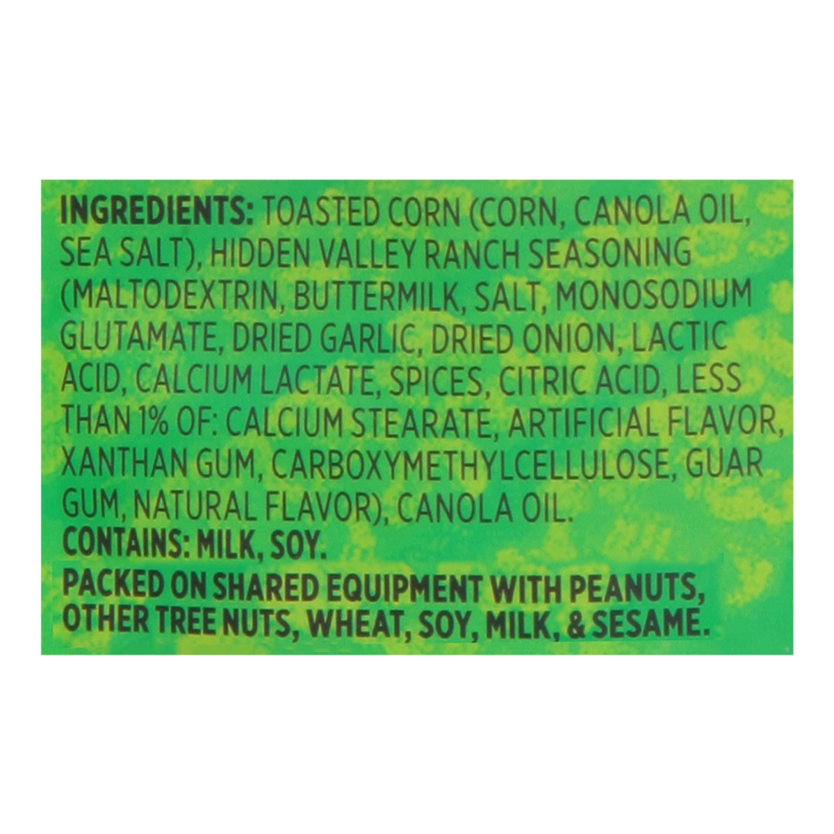 Toasted Corn (Corn, Canola Oil, Sea Salt), Hidden Valley Ranch Seasoning (Maltodextrin, Buttermilk, Salt, Monosodium Glutamate, Dried Garlic, Dried Onion, Lactic Acid, Calcium Lactate, Spices, Citric …