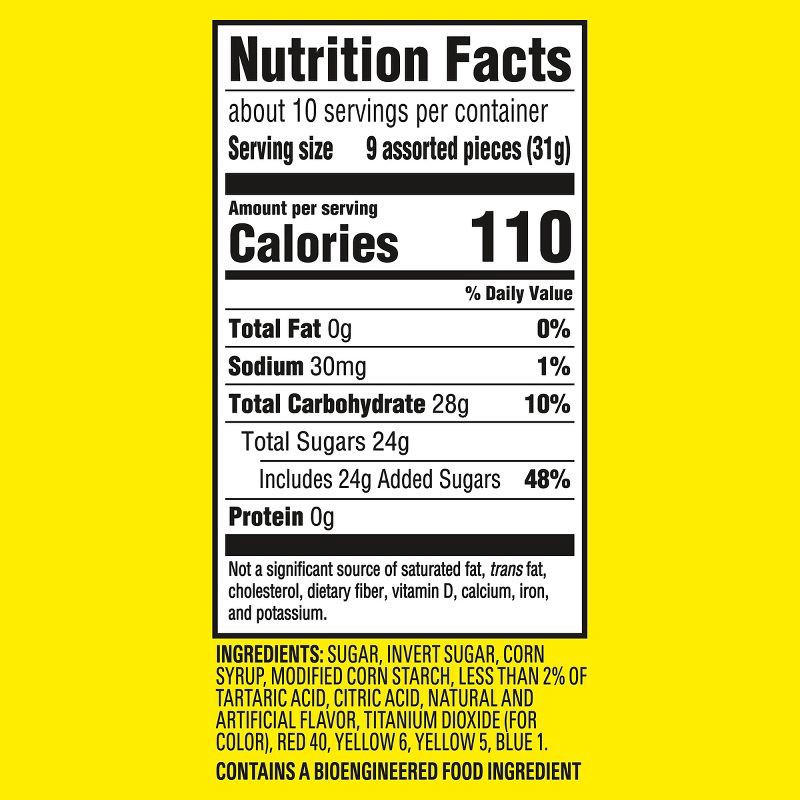 SUGAR, INVERT SUGAR, CORN SYRUP, MODIFIED CORN STARCH, LESS THAN 2% OF TARTARIC ACID, CITRIC ACID, NATURAL AND ARTIFICIAL FLAVOR, TITANIUM DIOXIDE (FOR COLOR), RED 40, YELLOW 6, YELLOW 5, BLUE 1.