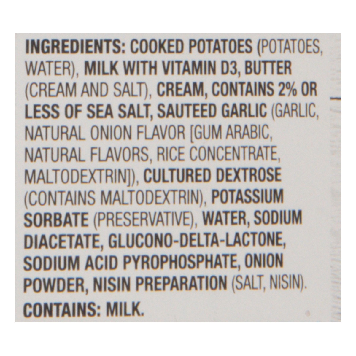 Ingredients: Cooked Potatoes (Potatoes, Water), Milk with Vitamin D3, Butter (Cream and Salt), Cream, Contains 2% or less of Sea Salt, Sautéed Garlic (Garlic, Natural Onion Flavor [Gum Arabic, Natural…