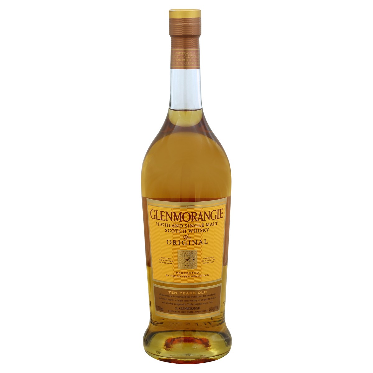 Highland single malt scotch whisky. Perfected by the sixteen men of Tain. Ten years old. Glenmorangie is renowned the world over for its elegant and floral spirit; a single malt whisky of exquisite fi…