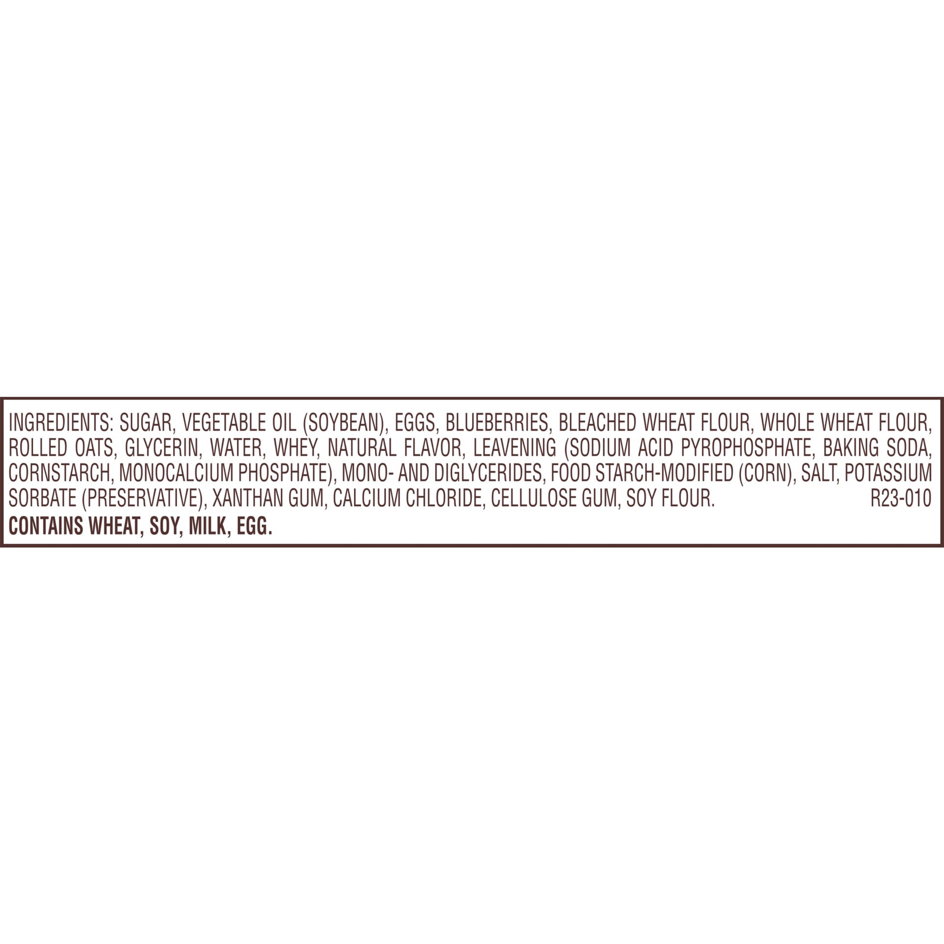 Sugar, Vegetable Oil (Soybean), Eggs, Blueberries, Bleached Wheat Flour, Whole Wheat Flour, Rolled Oats, Glycerin, Water, Whey, Natural Flavor, Leavening [Sodium Acid Pyrophosphate, Baking Soda, Corns…
