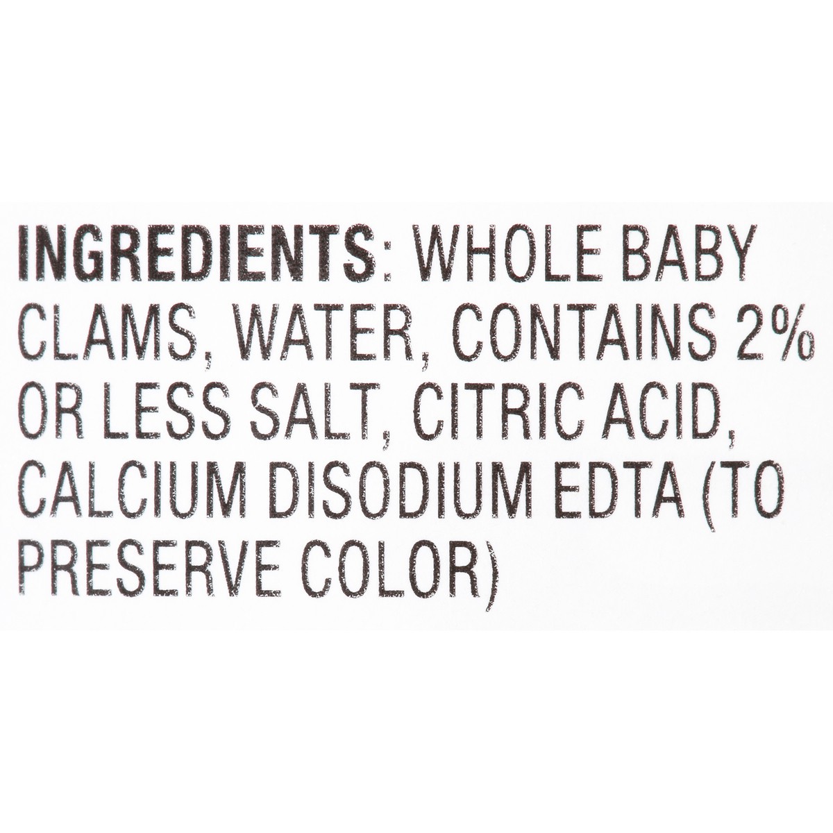 Whole Baby Clams, Water, Contains 2% or Less Salt, Citric Acid, Calcium Disodium EDTA (to Preserve Color).