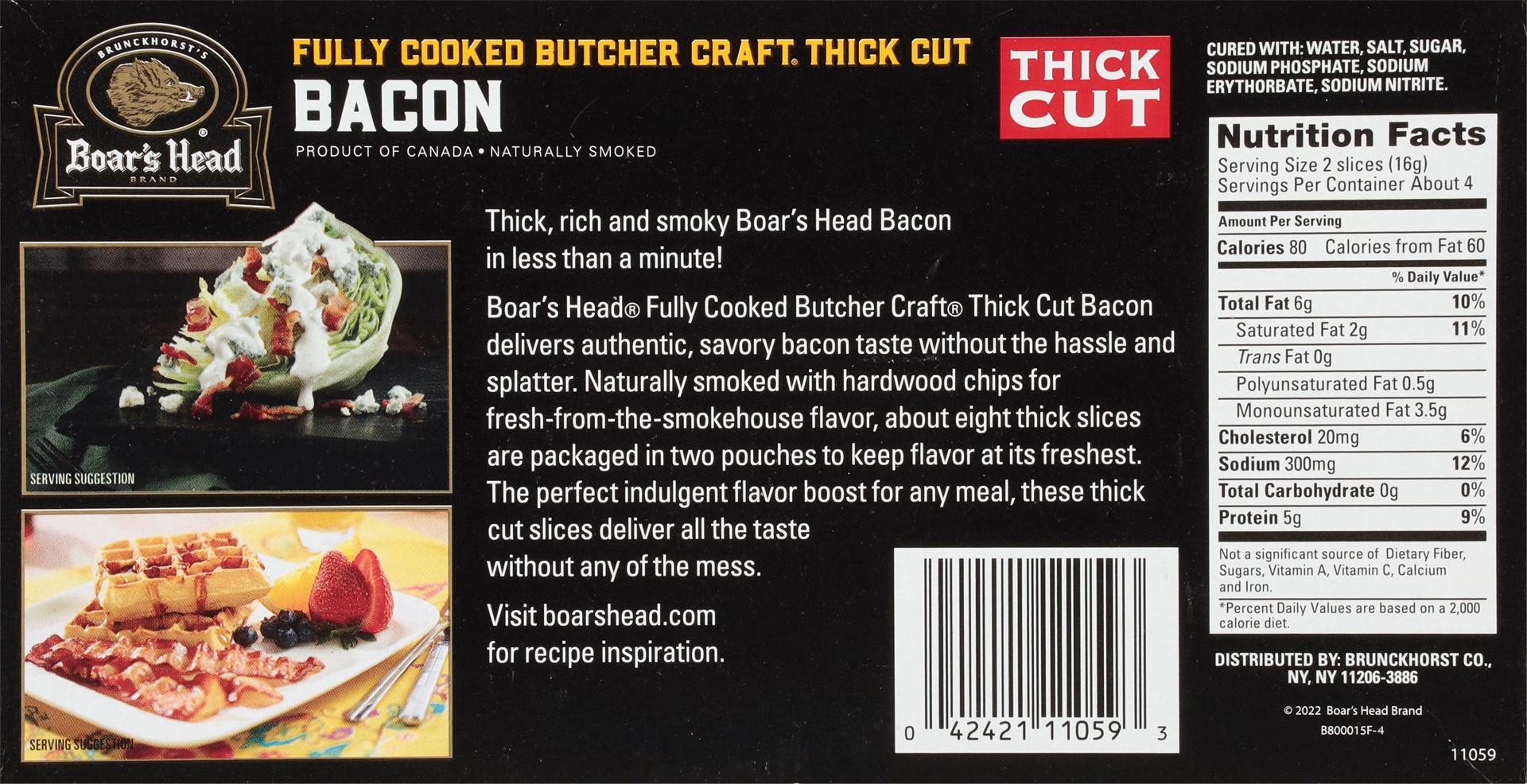 Crafted with top-quality pork belly, this bacon is smoked with hardwood chips and cooked to perfection. Boar's Head Thick Cut Naturally Smoked Bacon packs farm-fresh flavor into each Thick Cut slice.