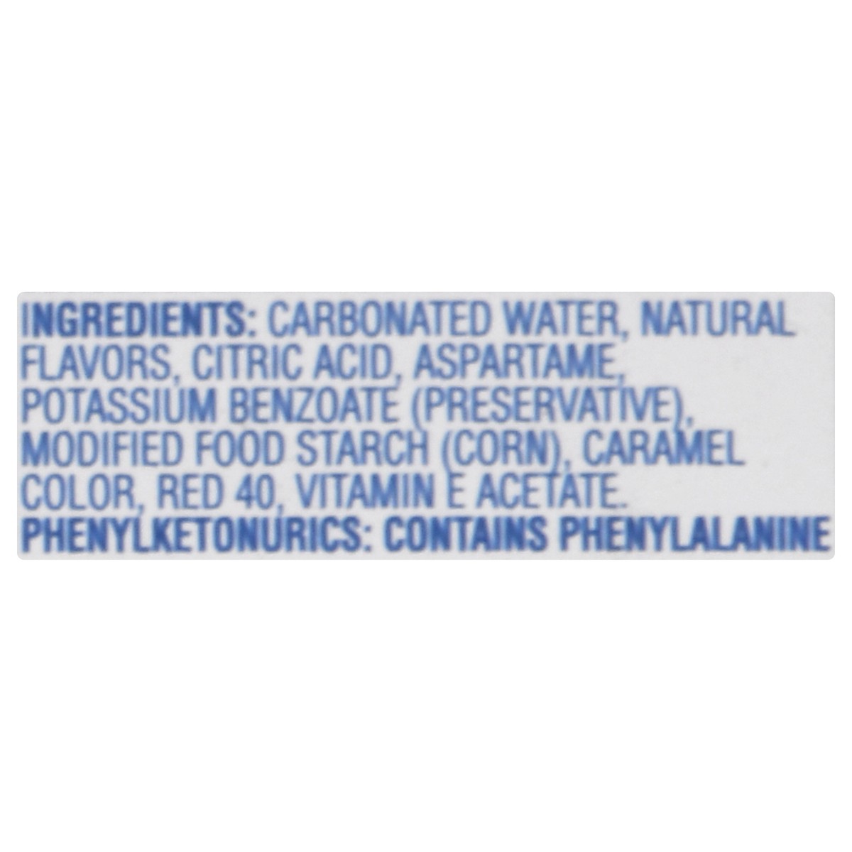 Carbonated Water, Natural Flavors, Citric Acid, Aspartame, Potassium Benzoate (Preservative), Modified Food Starch (Corn), Caramel Color, Red 40, Vitamin E Acetate.