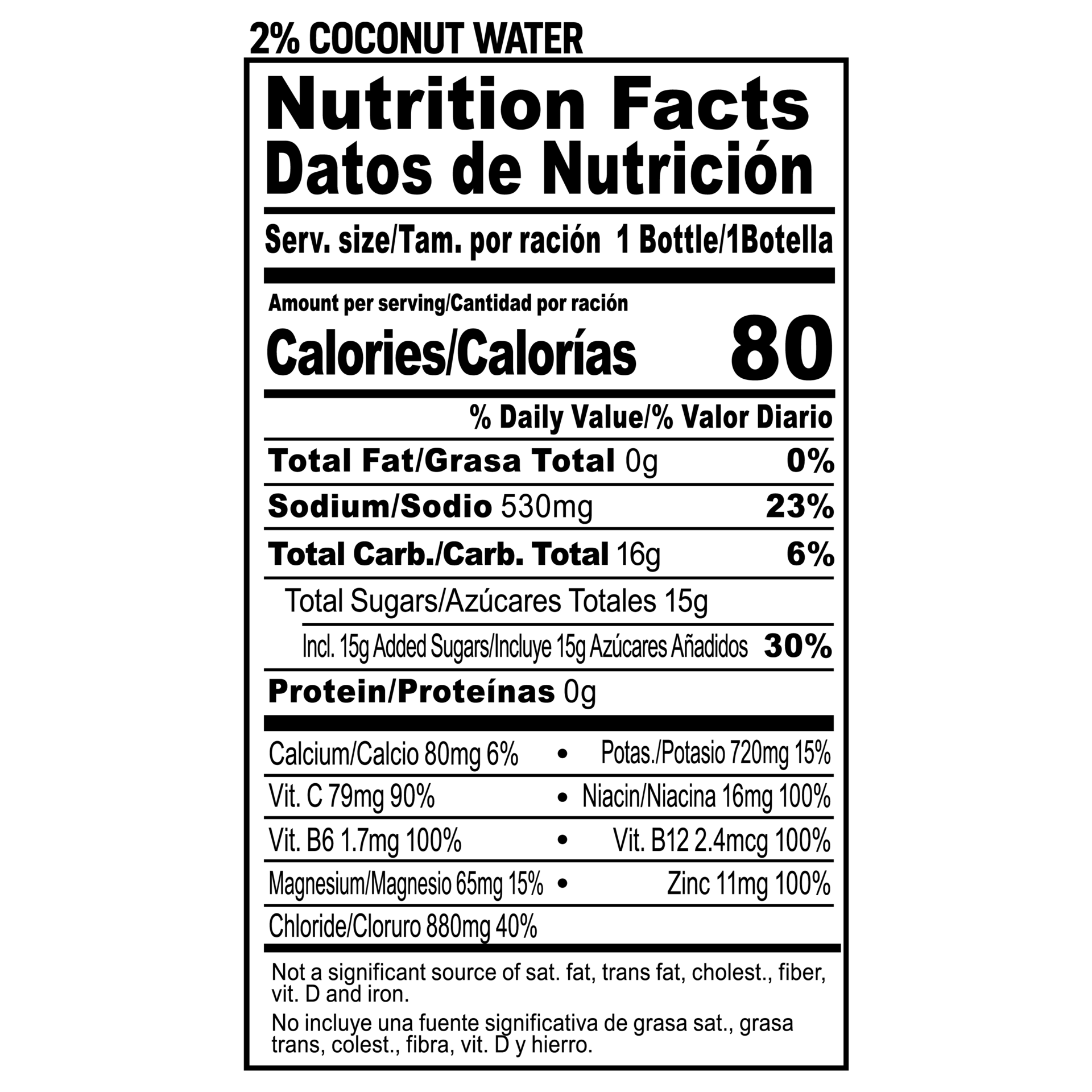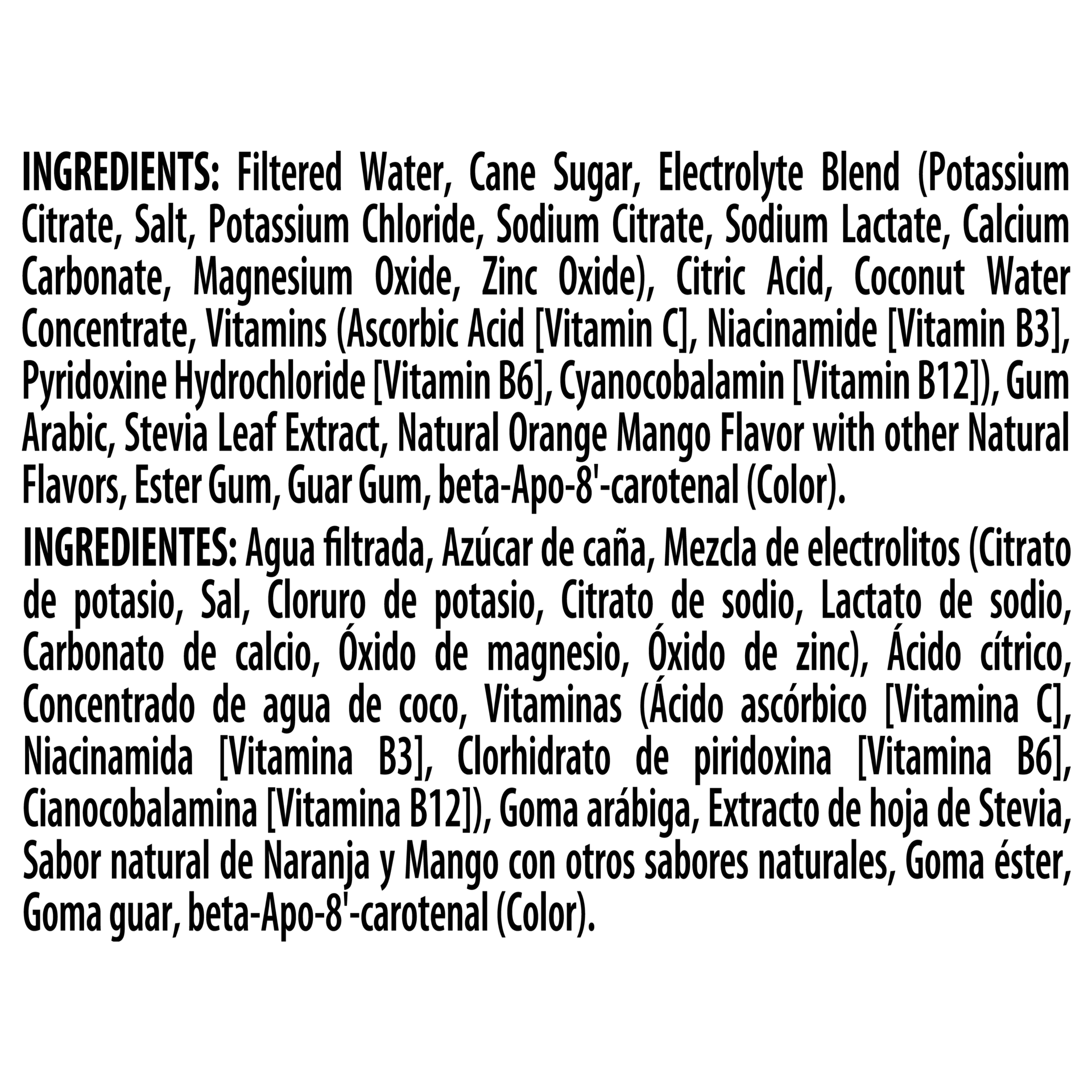 Filtered Water, Pure Cane Sugar, Citric Acid, Potassium Citrate (Electrolyte), Salt (Electrolyte), Coconut Water Concentrate, Potassium Chloride (Electrolyte), Sodium Citrate (Electrolyte), Sodium Lac…