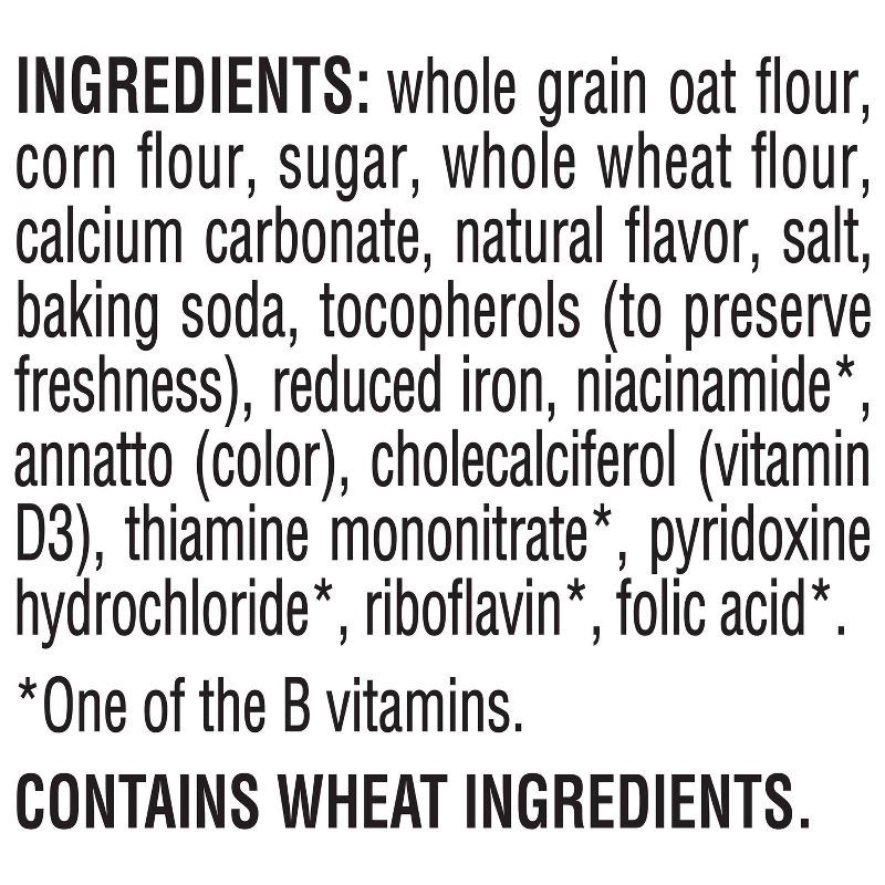 Whole Grain Oat Flour, Corn Flour, Sugar, Whole Wheat Flour, Calcium Carbonate, Natural Flavor, Salt, Baking Soda, Tocopherols (To Preserve Freshness), Reduced Iron, Niacinamide*, Annatto (Color), Cho…
