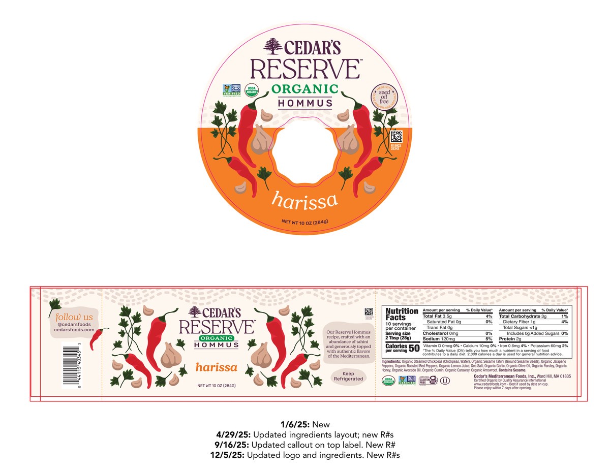 No matter your craving, Cedar's Reserve Organic Harissa Hommus delivers, with Cedar's Reserve Organic Hommus signature bold flavors. A fiery treat, this Organic Hommus combines the naturally smokey fl…
