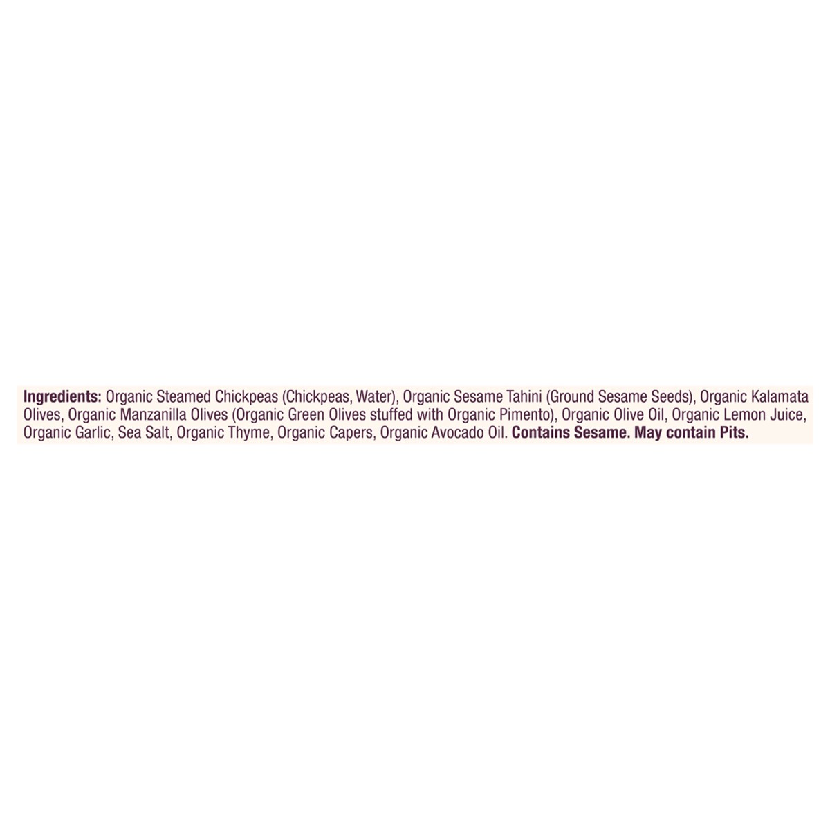Organic Steamed Chickpeas (Chickpeas, Water), Organic Sesame Tahini (Ground Sesame Seeds), Organic Kalamata Olives, Organic Manzanilla Olives (Organic Green Olives Stuffed with Organic Pimento), Organ…