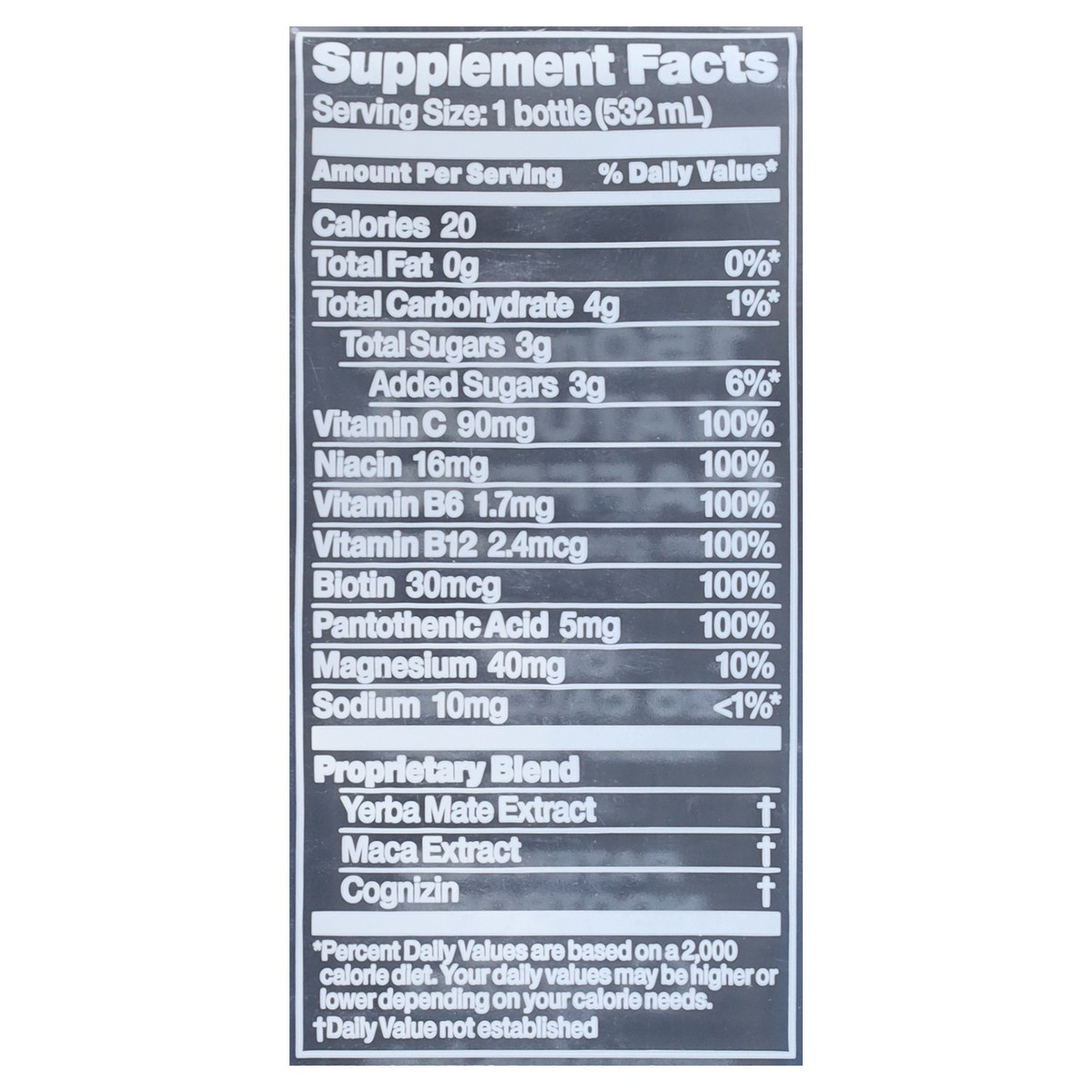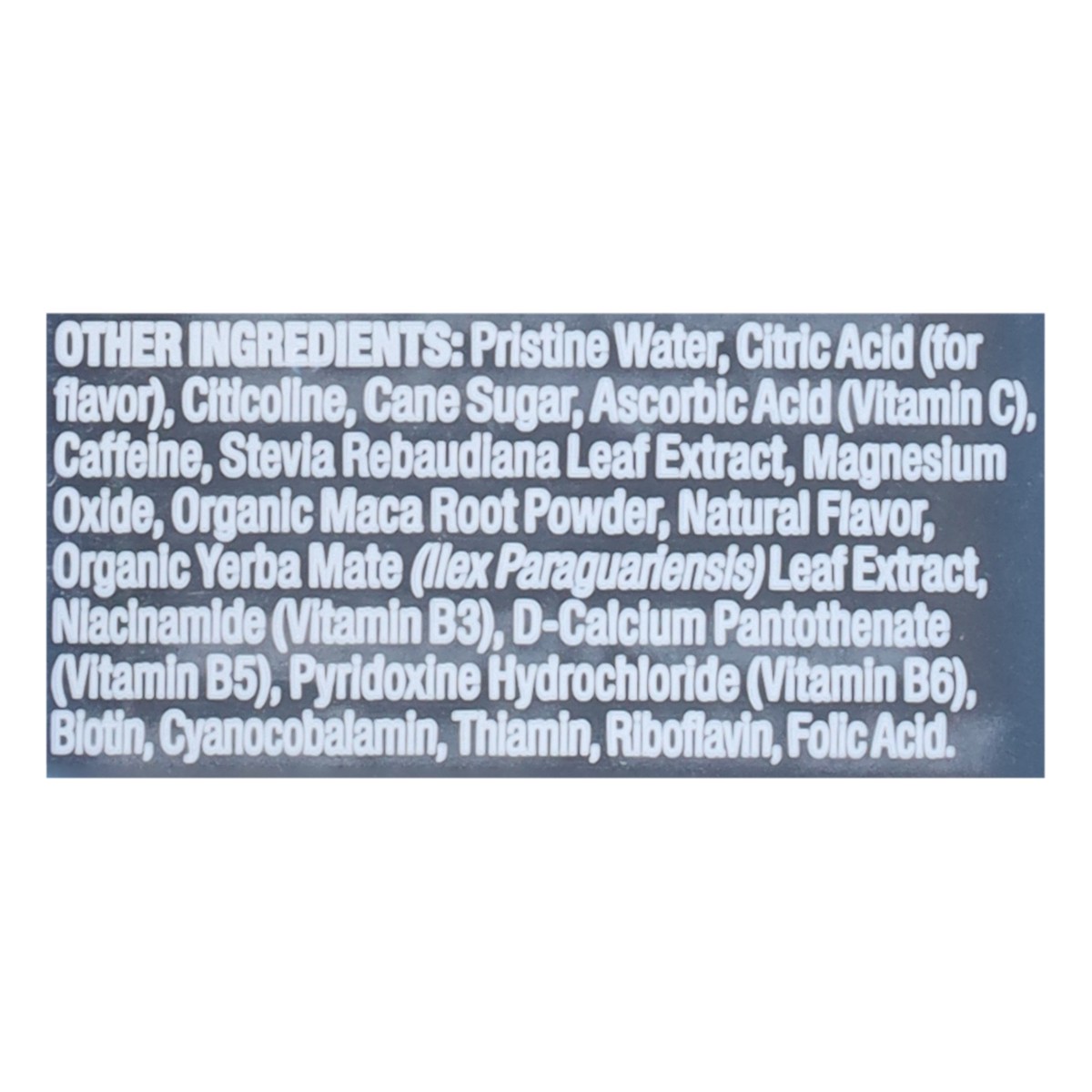 Proprietary Blend: Yerba Mate Extract, Maca Extract, Cognizin. Other Ingredients: Pristine Water, Citric Acid (for Flavor), Citicoline, Cane Sugar, Ascorbic Acid (Vitamin C), Caffeine, Stevia Rebaudia…