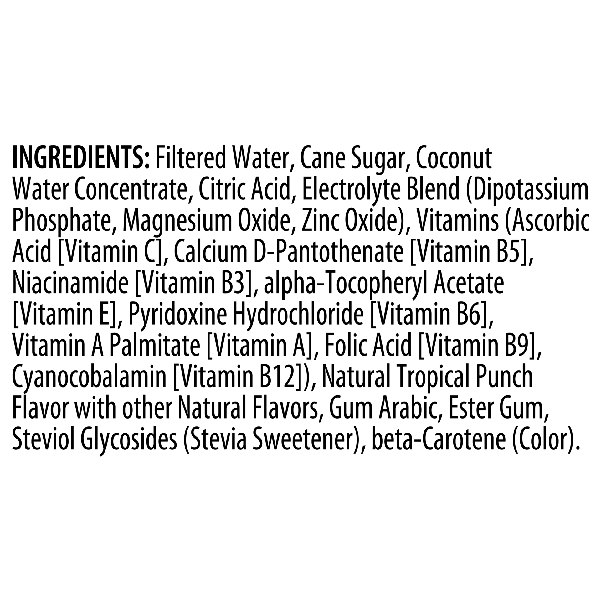 Filtered Water, Pure Cane Sugar, Coconut Water Concentrate, Citric Acid, Dipotassium Phosphate (Electrolyte), Ascorbic Acid (Vitamin C), Magnesium Oxide (Electrolyte), Natural Tropical Punch Flavor wi…