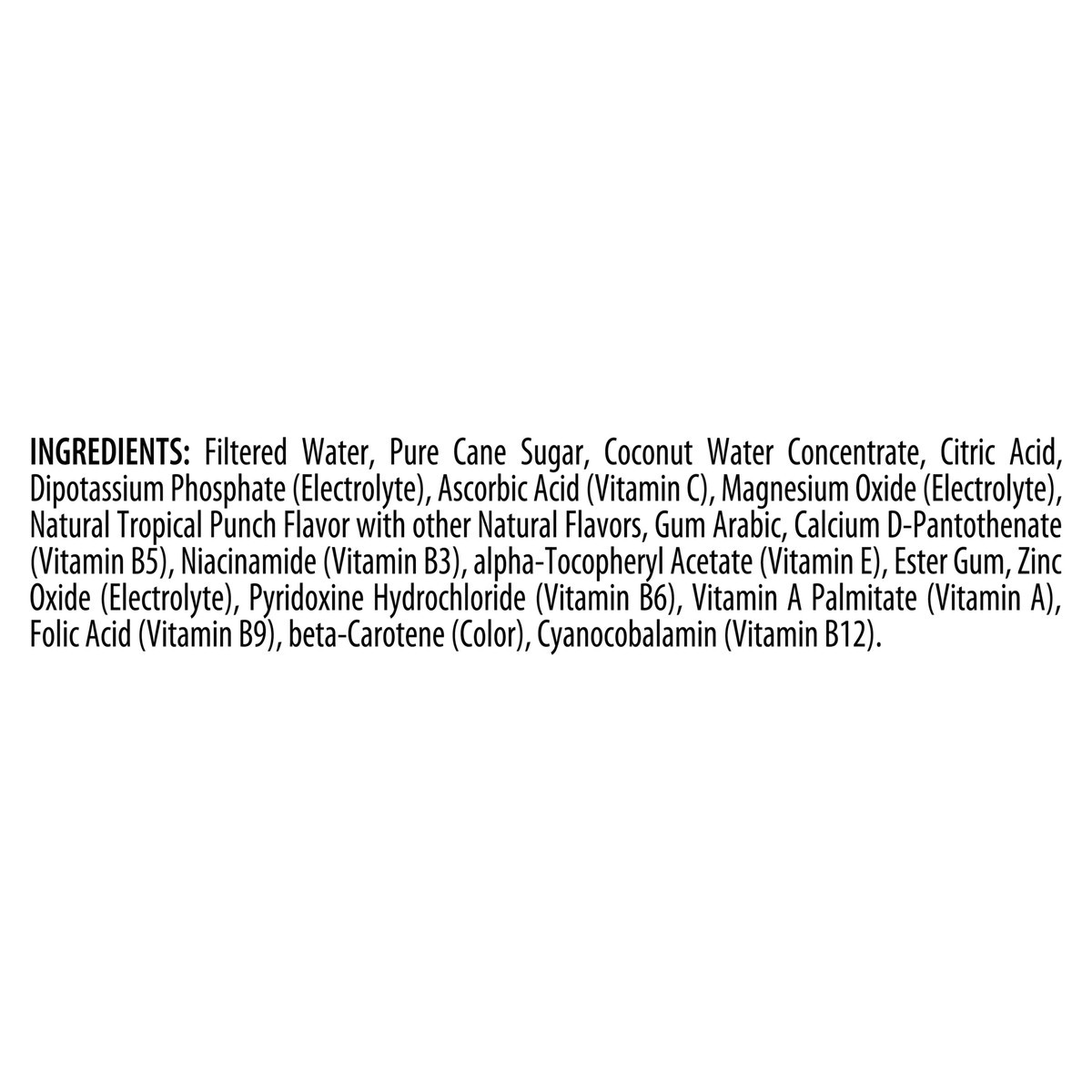 Filtered Water, Pure Cane Sugar, Coconut Water Concentrate, Citric Acid, Dipotassium Phosphate (Electrolyte), Ascorbic Acid (Vitamin C), Magnesium Oxide (Electrolyte), Natural Tropical Punch Flavor Wi…