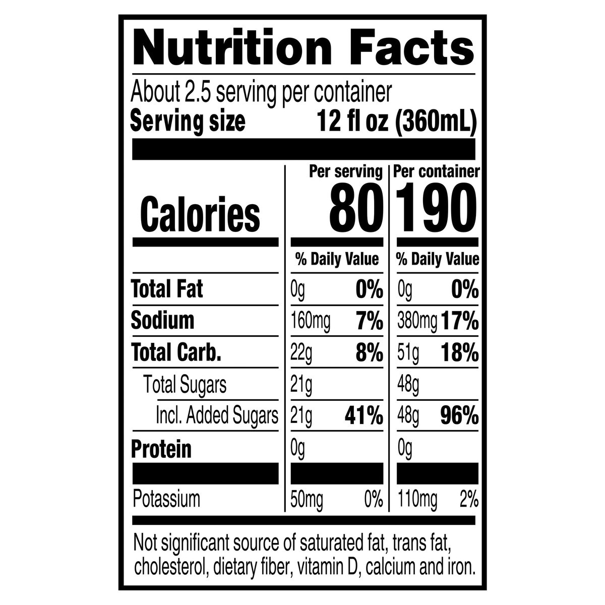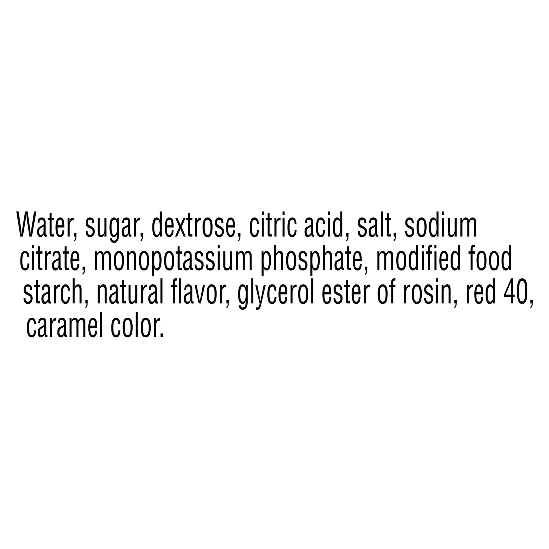 Water, Sugar, Dextrose, Citric Acid, Salt, Sodium Citrate, Monopotassium Phosphate, Modified Food Starch, Natural Flavor, Glycerol Ester of Rosin, Red 40, Caramel Color.