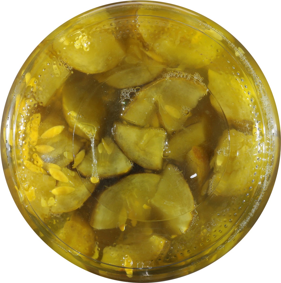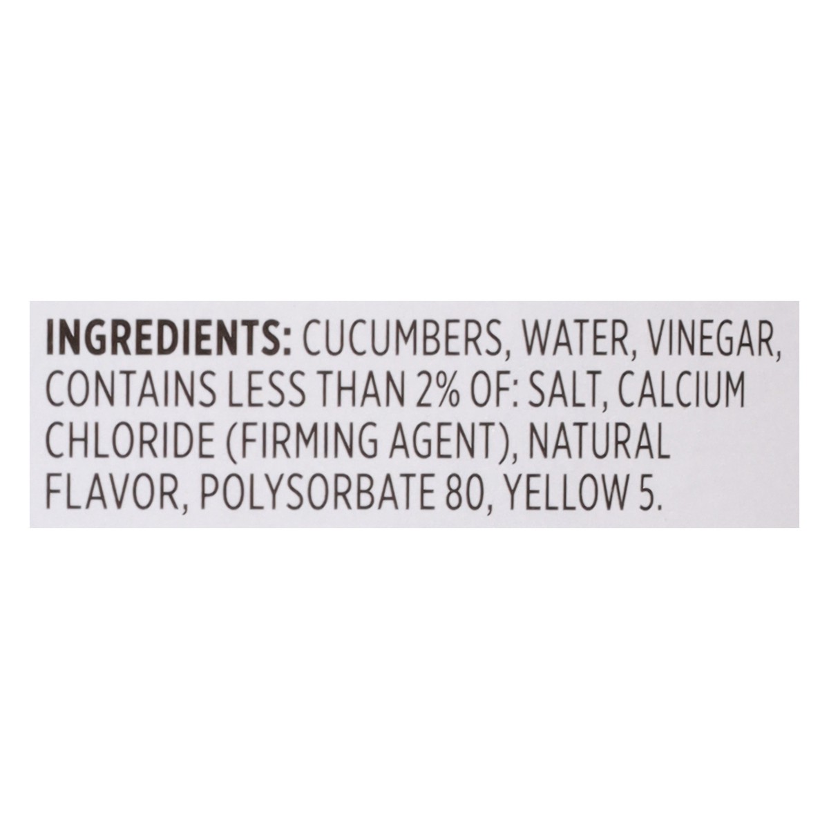 Cucumbers, Water, Vinegar, Contains Less than 2% of: Salt, Calcium Chloride (Firming Agent), Natural Flavor, Polysorbate 80, Yellow 5.