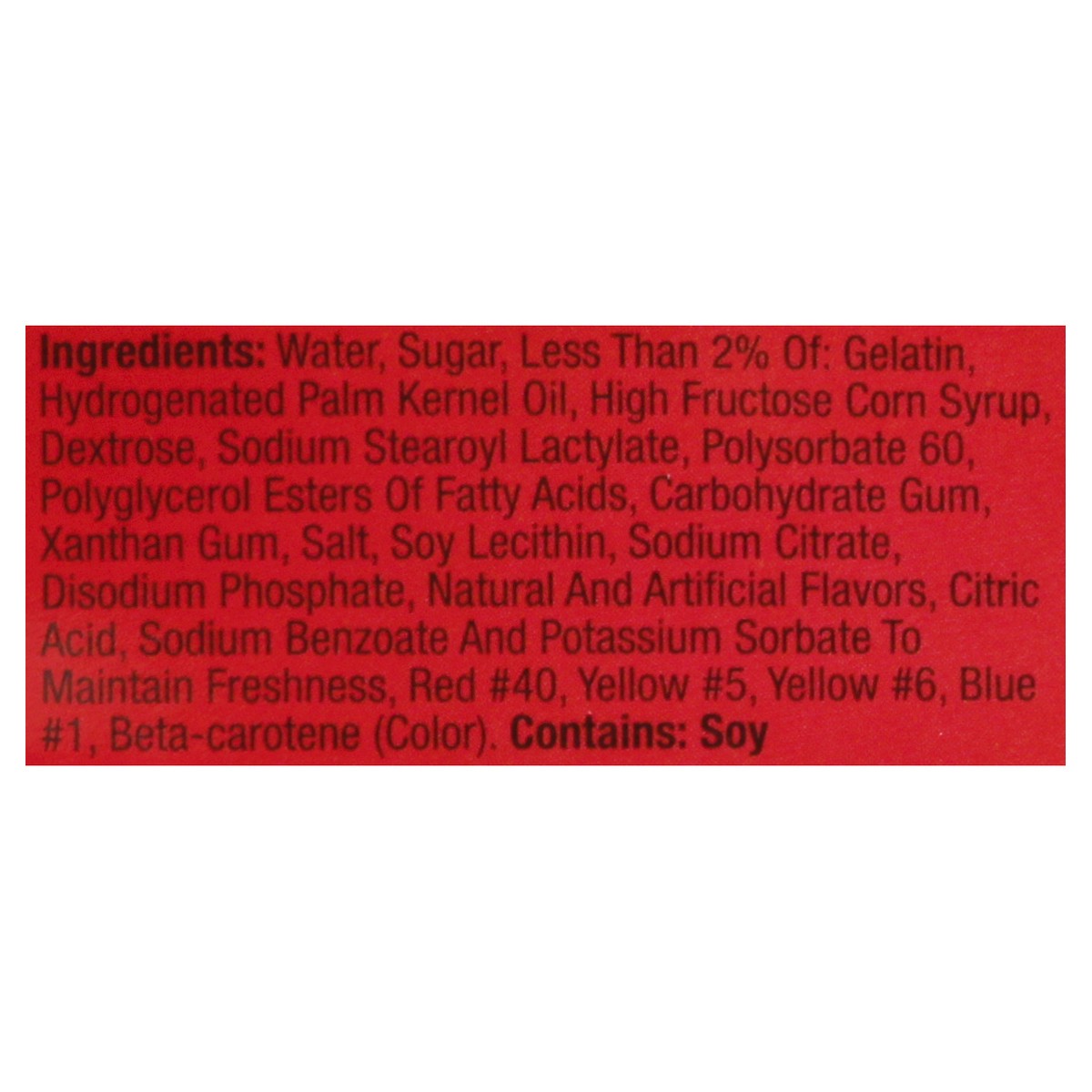 Water, Sugar, Less than 2% of: Gelatin, Hydrogenated Palm Kernel Oil, High Fructose Corn Syrup, Dextrose, Sodium Stearoyl Lactylate, Polysorbate 60, Polyglycerol Esters of Fatty Acids, Carbohydrate Gu…