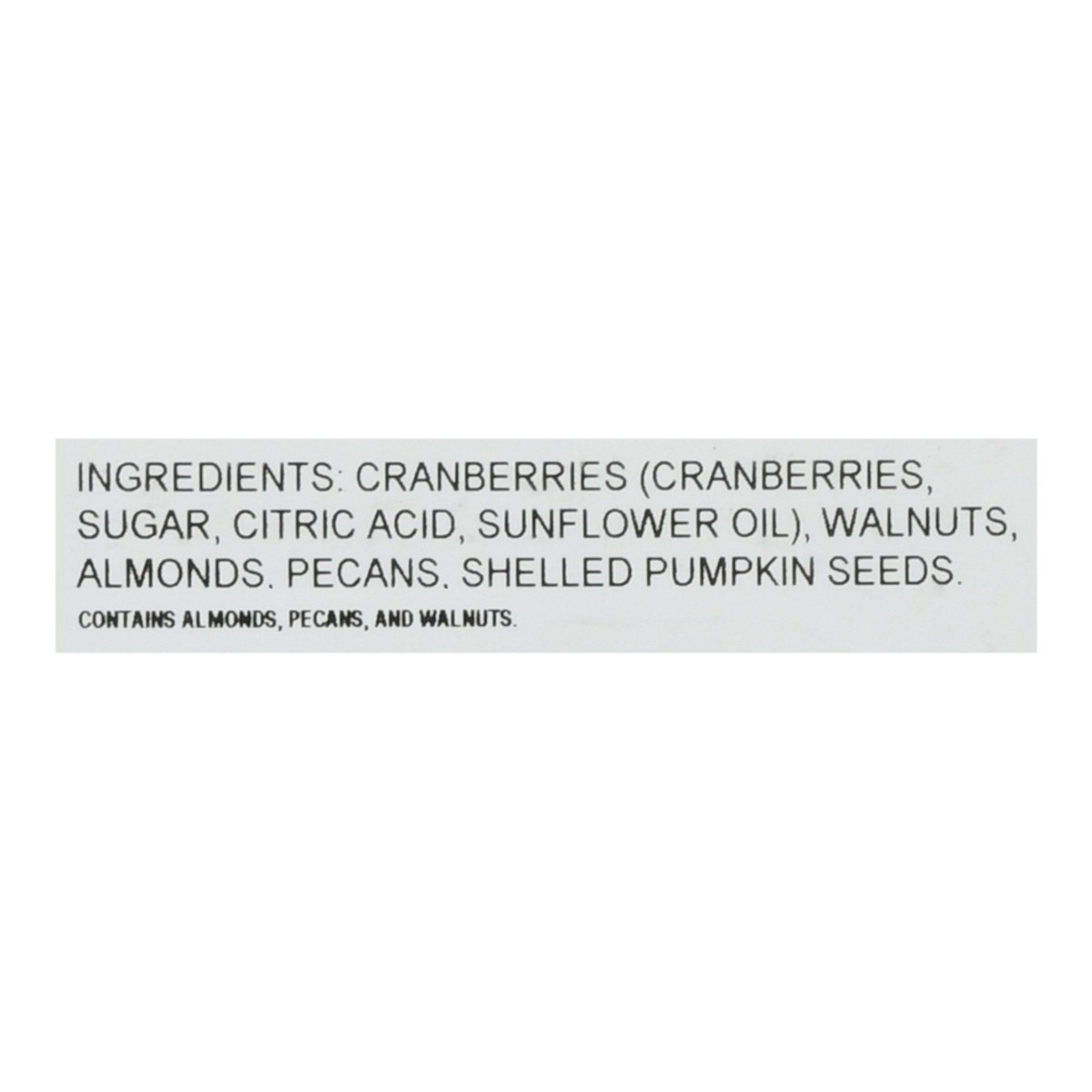Cranberries (Cranberries, Sugar, Citric Acid, Sunflower Oil), Walnuts, Almonds, Pecans, Shelled Pumpkin Seeds.