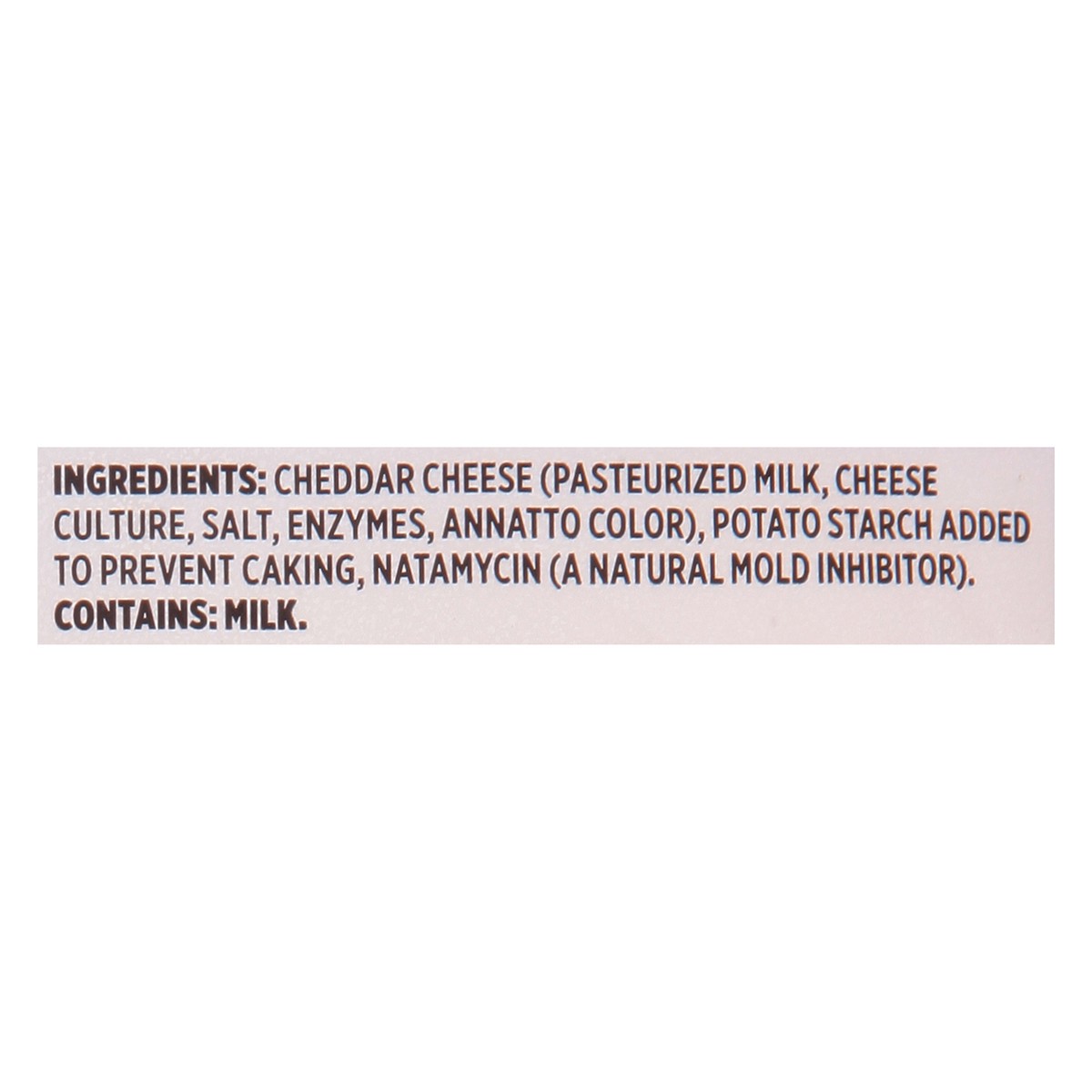 Cheddar Cheese (Pasteurized Milk, Cheese Culture, Salt, Enzyme, Annatto Color), Potato Starch Added to Prevent Caking, Natamycin (a Natural Mold Inhibitor).