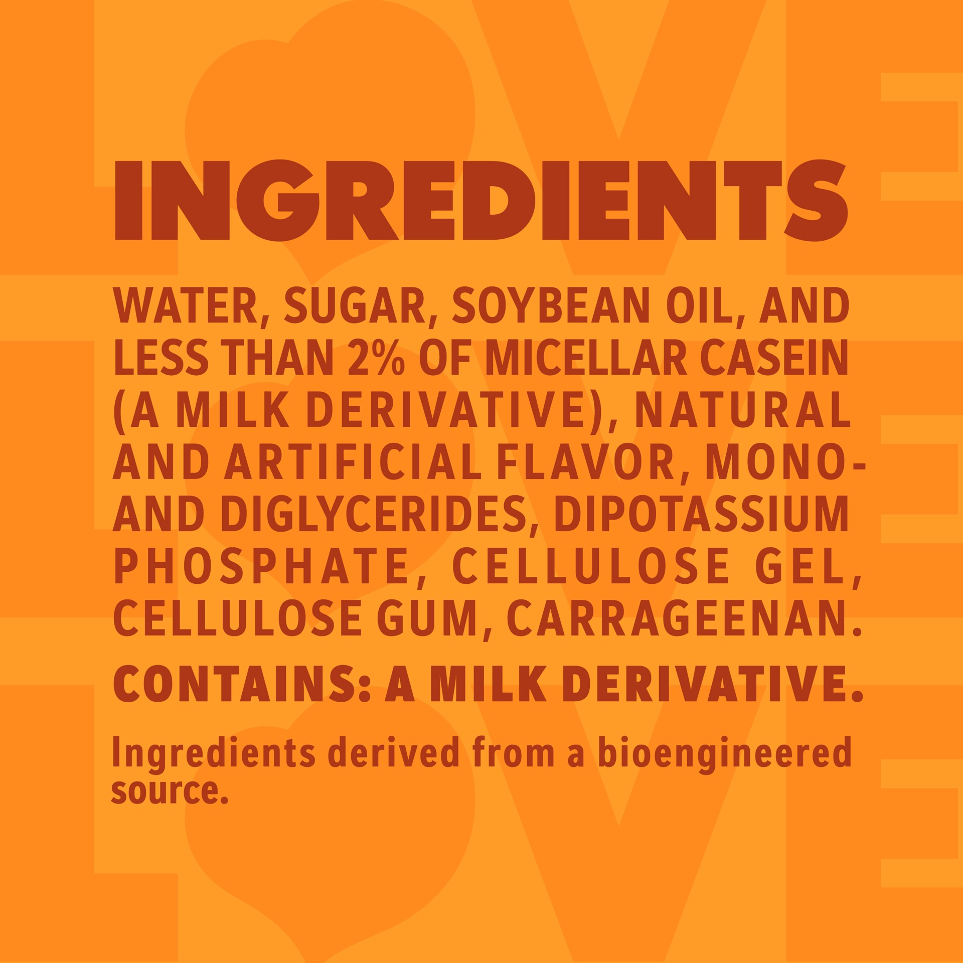 WATER, SUGAR, SOYBEAN OIL, AND LESS THAN 2% OF DIPOTASSIUM PHOSPHATE, MICELLAR CASEIN (A MILK DERIVATIVE), MONO- AND DIGLYCERIDES, CELLULOSE GEL, NATURAL AND ARTIFICIAL FLAVOR, CELLULOSE GUM, CARRAGEE…