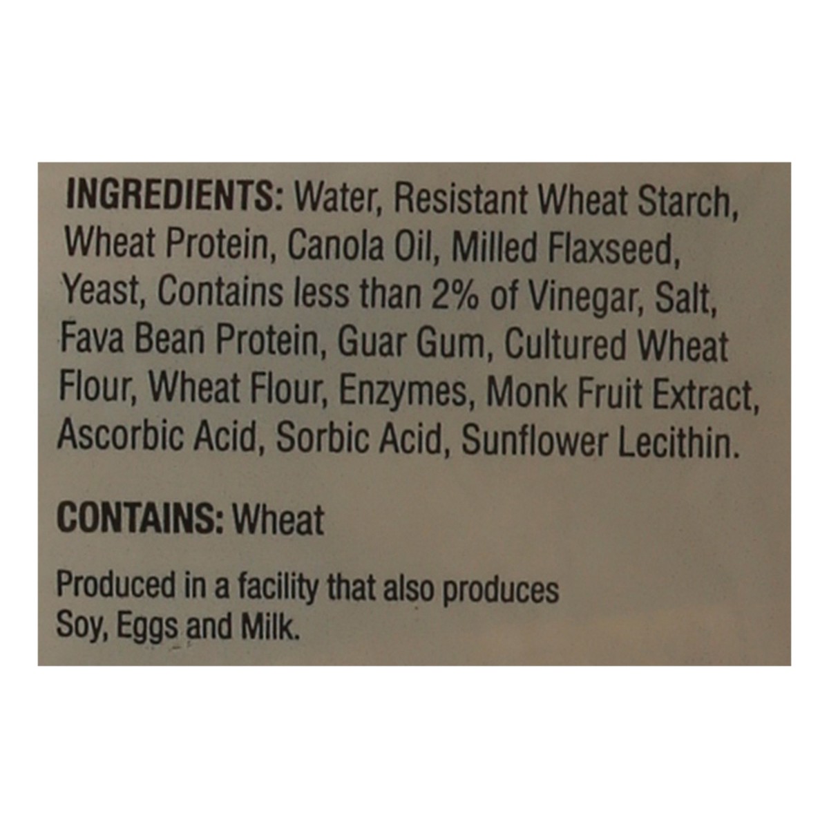 Water, Resistant Wheat Starch, Wheat Protein, Canola Oil, Milled Flaxseed, Yeast, Contains Less than 2% of Vinegar, Salt, Fava Bean Protein, Guar Gum, Cultured Wheat Flour, Wheat Flour, Enzymes, Monk …
