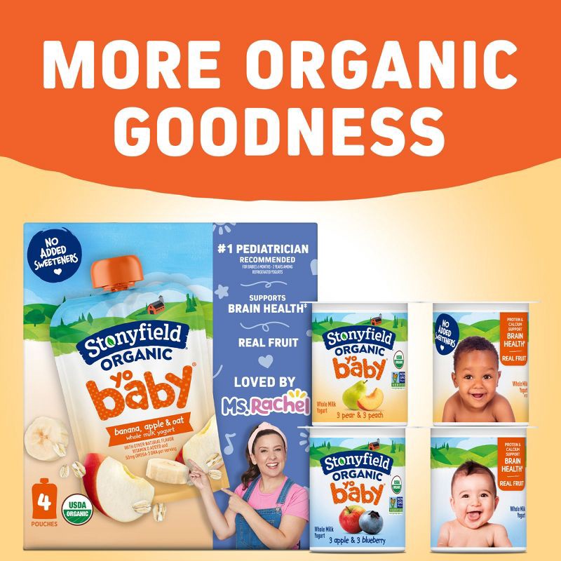- Six 4 oz cups of Stonyfield Organic YoBaby No Added Sweeteners Pear & Peach Whole Milk Baby Yogurt